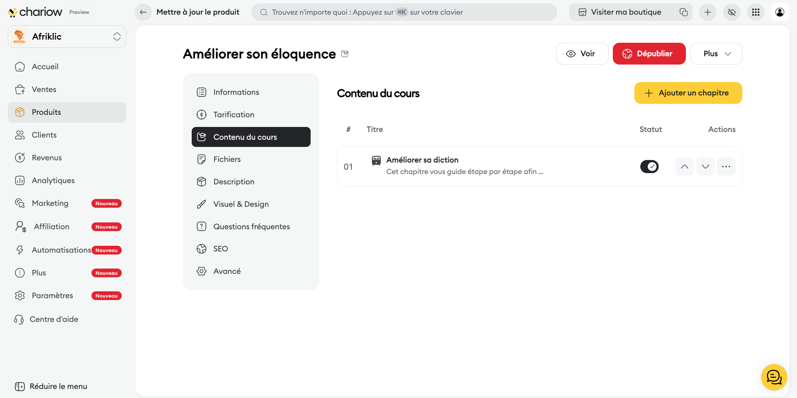 Organisation des chapitres : Vous pouvez ajouter de nouveaux chapitres, les supprimer ou modifier leur ordre.