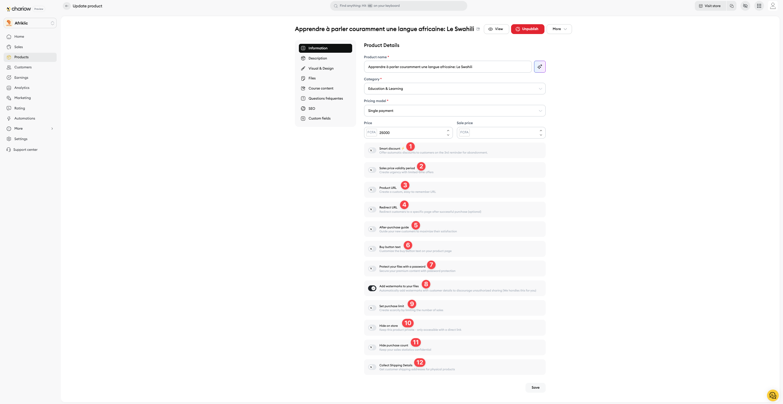Once your course is created, you can personalize it by turning on different features to make the learning experience better and manage your sales. Here’s an overview of what you can do on the product details page.