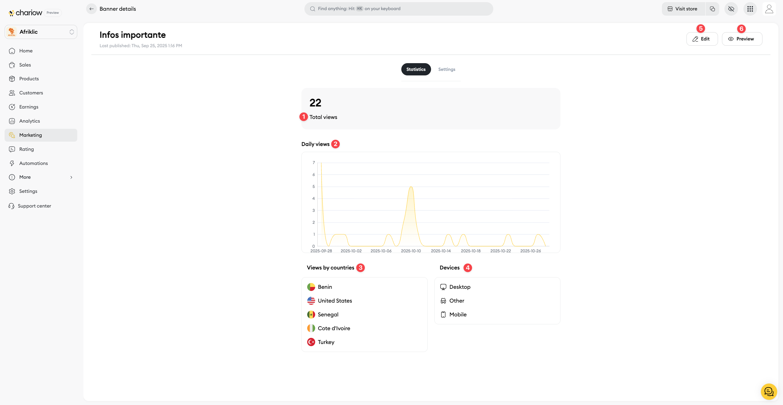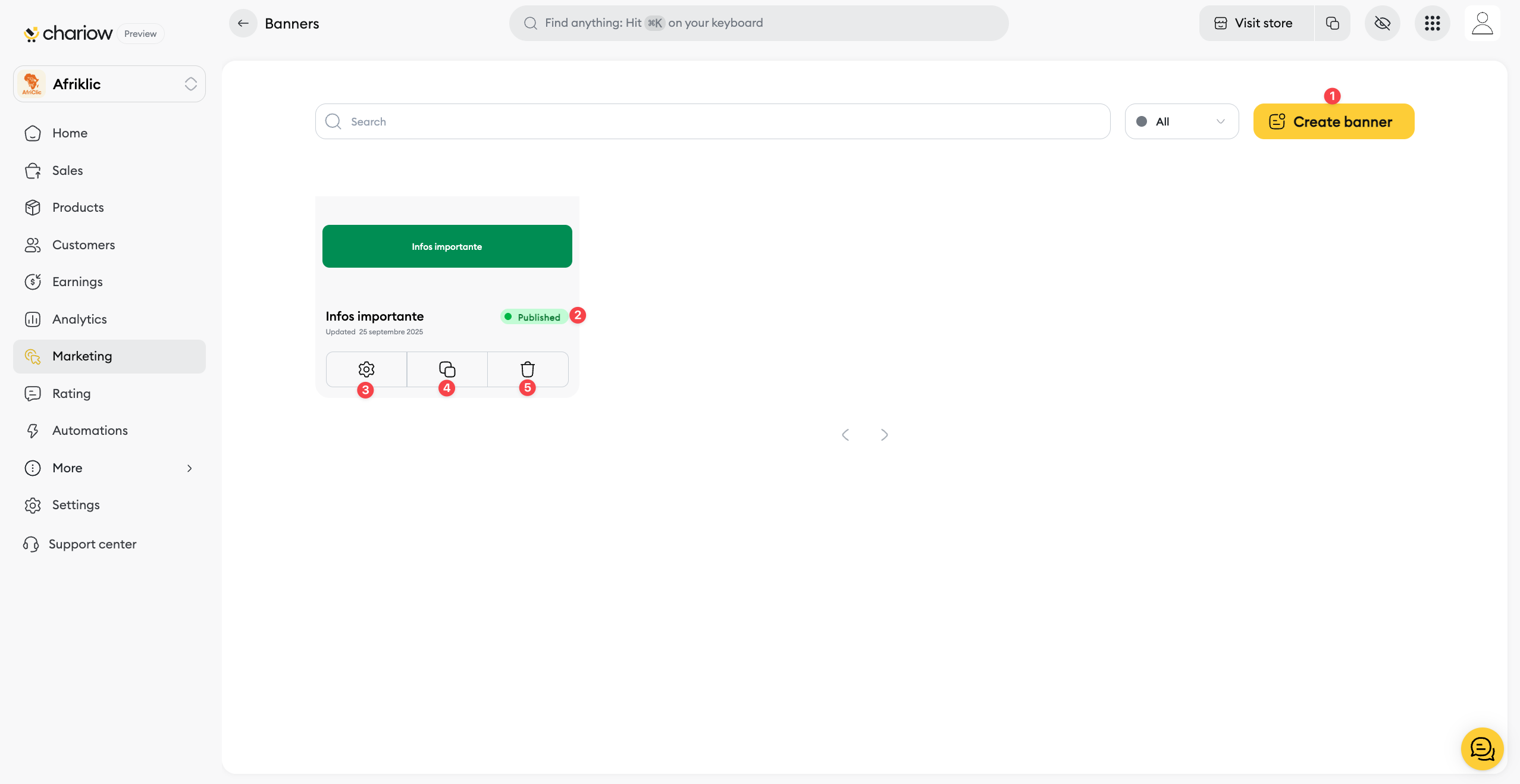 Once your banner is published, it's important to track its performance to see how effective it is and tweak your messages. Chariow gives you analytics tools to help you understand how your visitors interact with your banner.