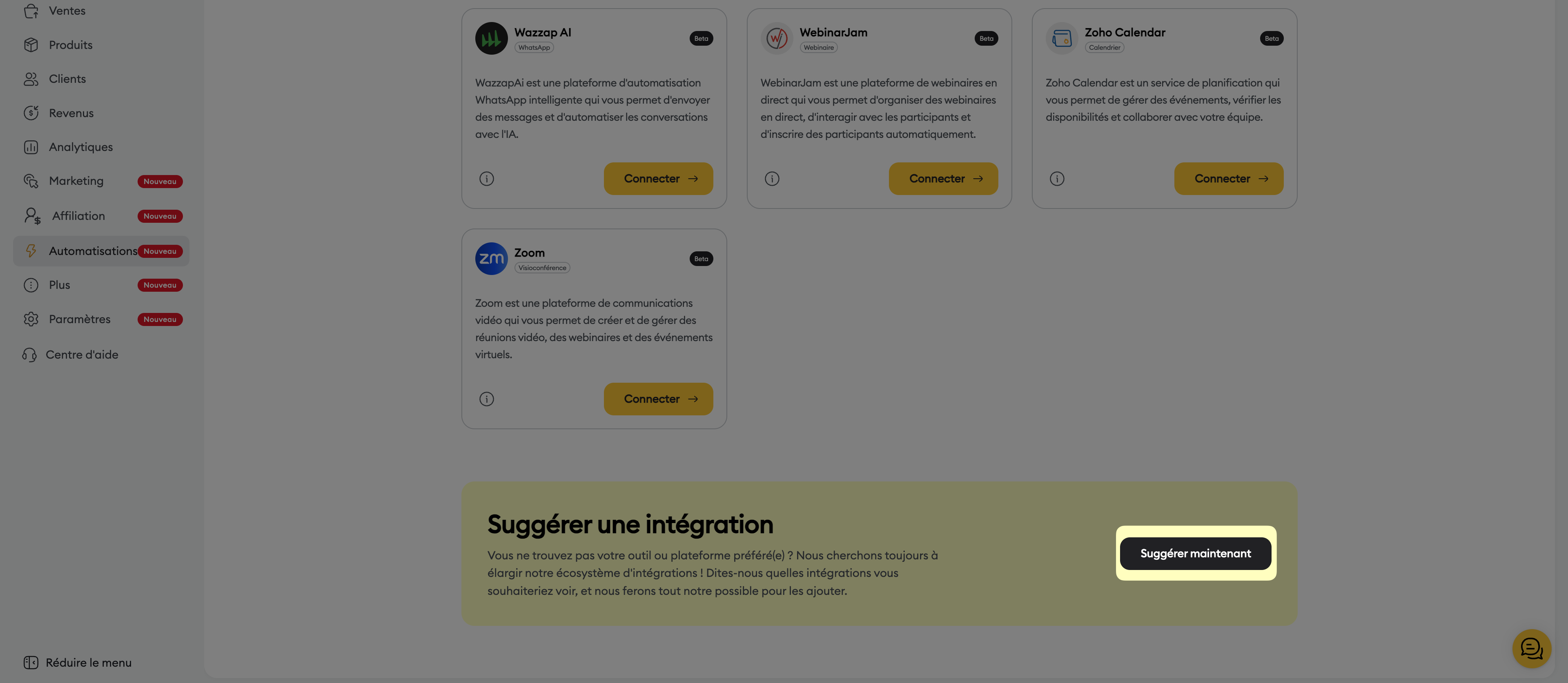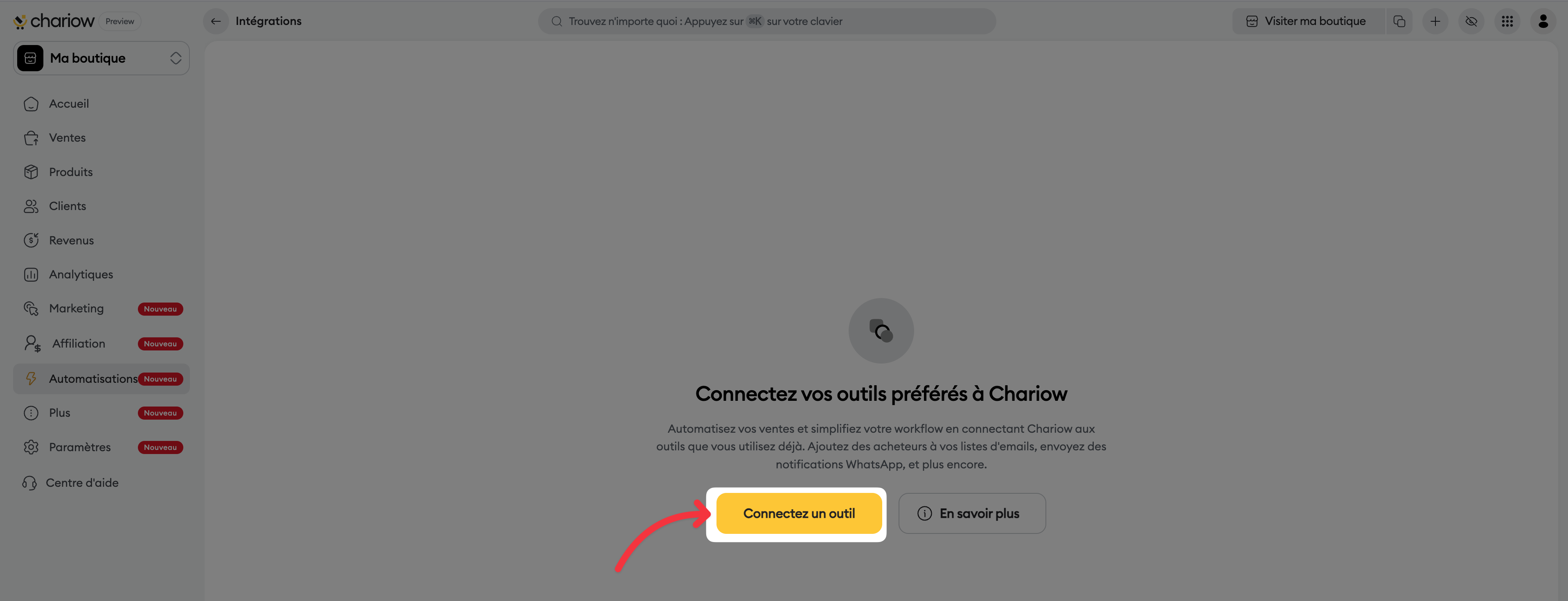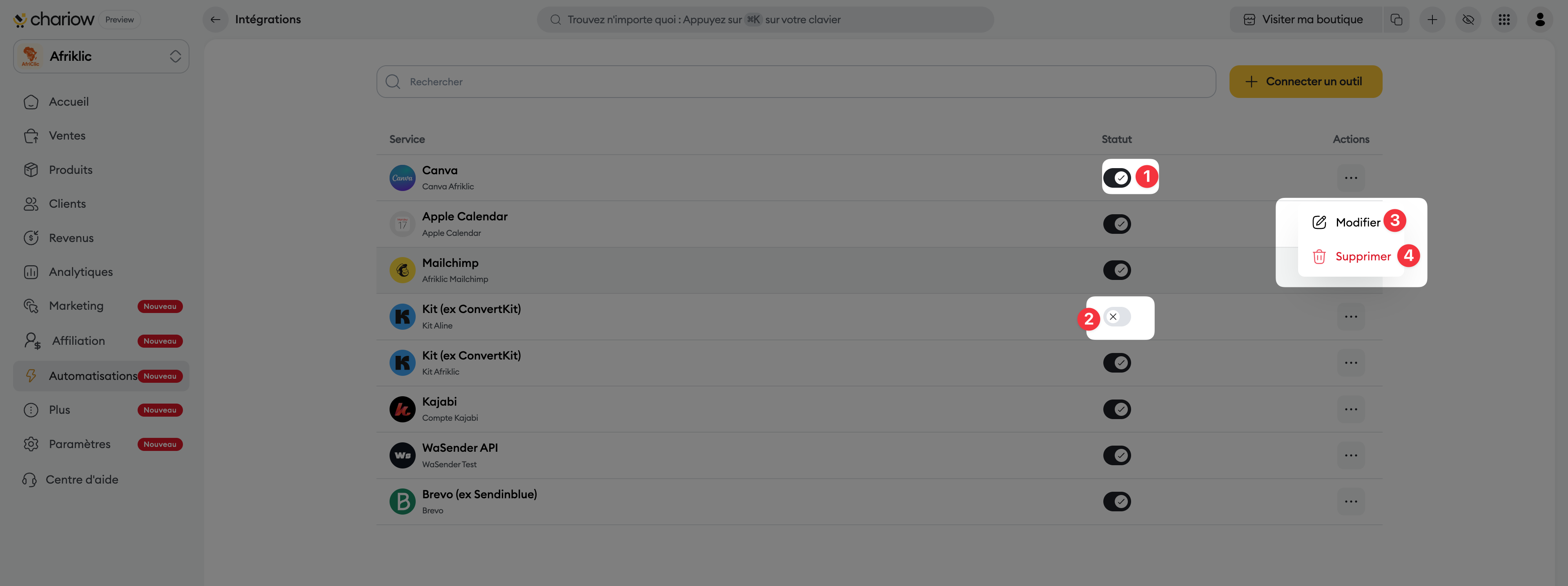 Ajouter une intégration sur votre boutique Chariow vous permet de connecter vos outils préférés pour automatiser des tâches. Cela vous permet d’optimiser la gestion de vos clients et de vos campagnes. Vous gagnez ainsi du temps pour développer votre entreprise plus efficacement.