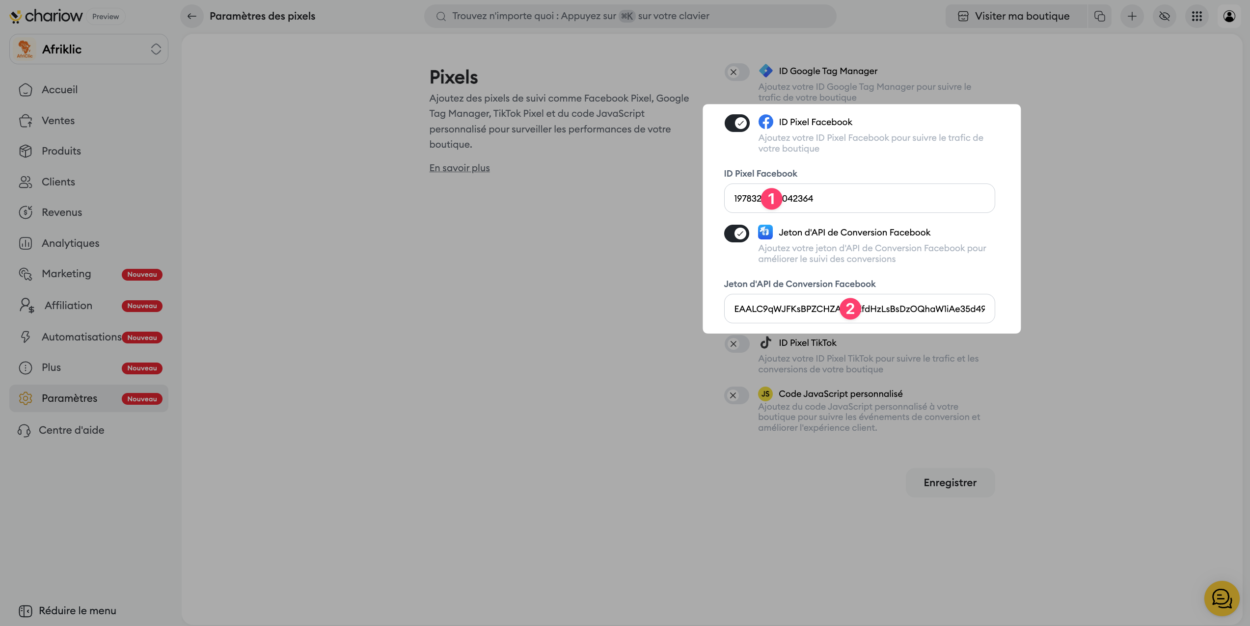 Collez votre ID de Pixel Meta (si ce n'est pas déjà fait) dans le champ approprié(1).