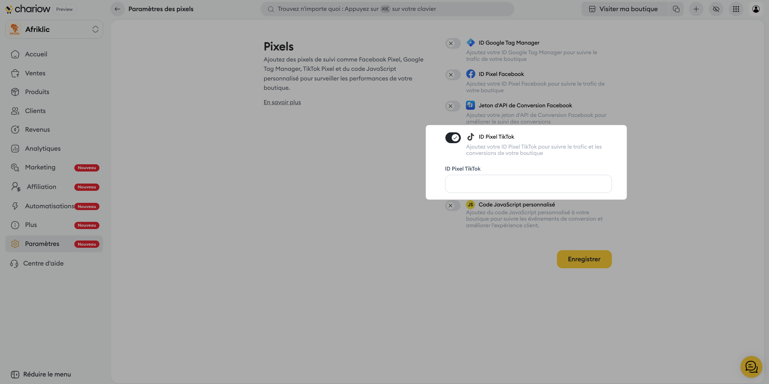 Activez l’option dédiée à TikTok, intitulée "ID Pixel TikTok".