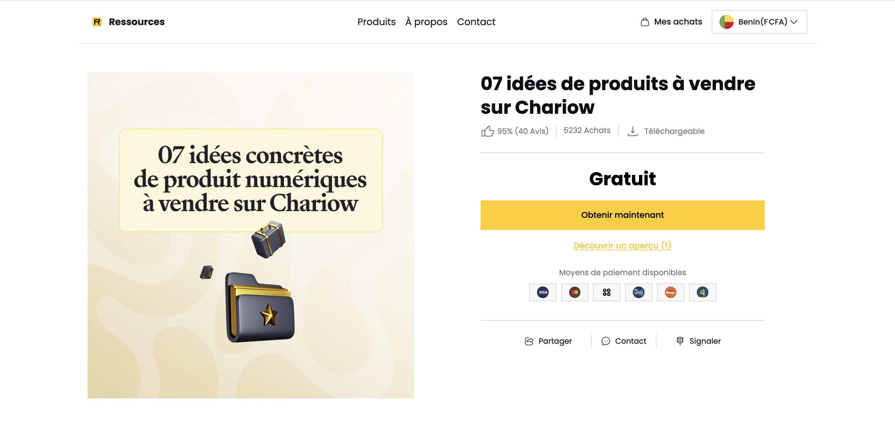 Accédez au guide : 7 Idées de Produits à Vendre sur Chariow ! Le lien vous dirigera directement vers la boutique Ressources de Chariow.