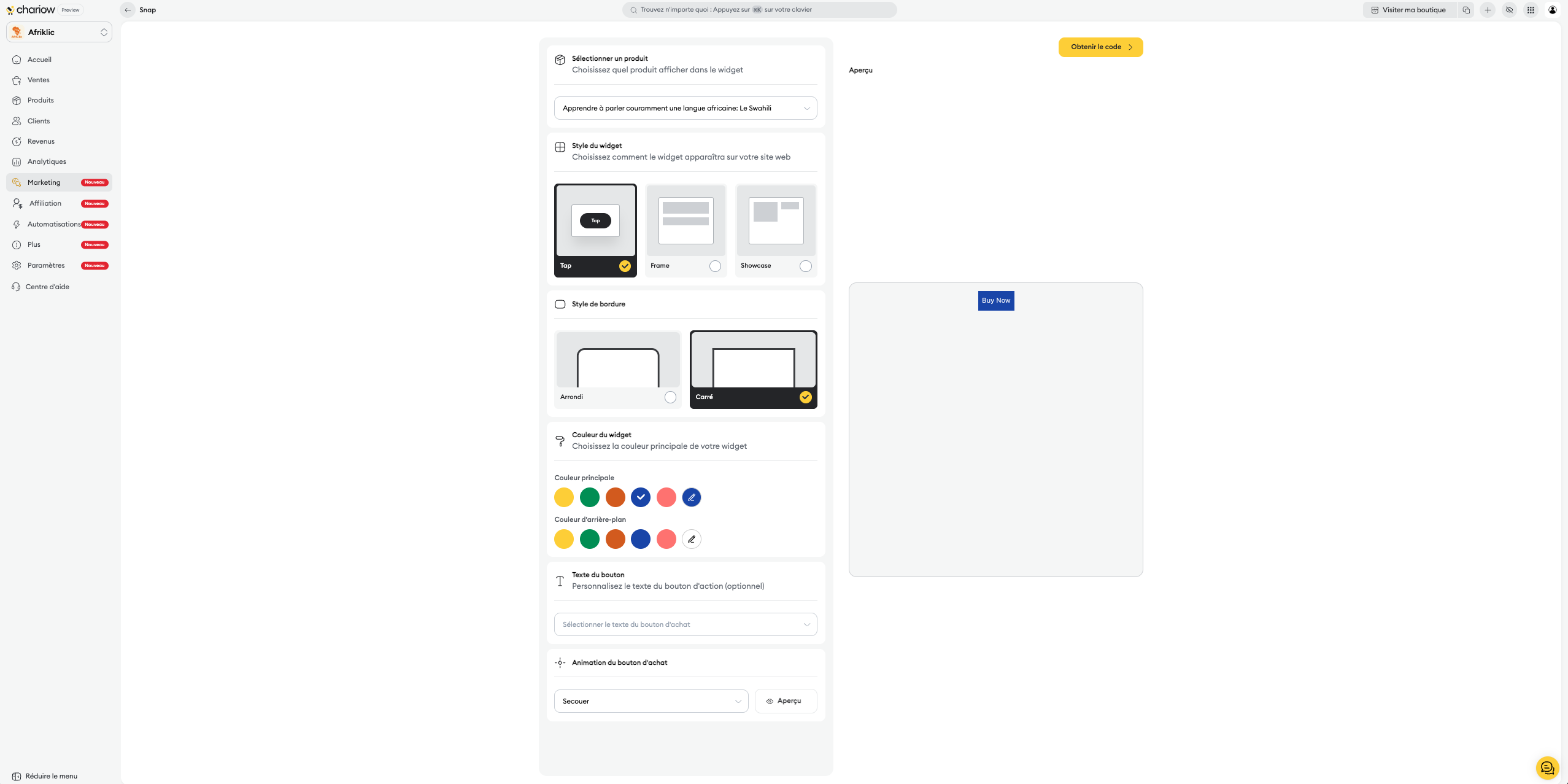Cliquez sur le bouton “Obtenir le code” pour finaliser la personnalisation et accéder à la page 'Code du widget'.