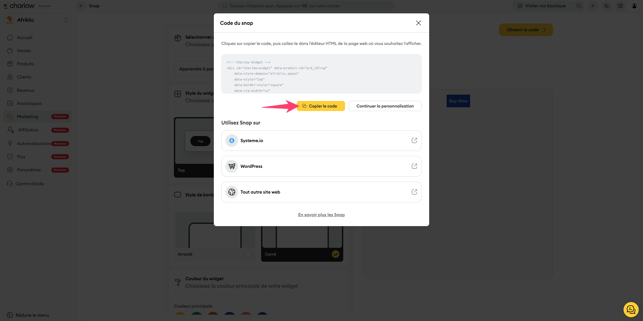 La création d'un widget Snap se fait en quelques étapes simples dans votre tableau de bord Chariow :