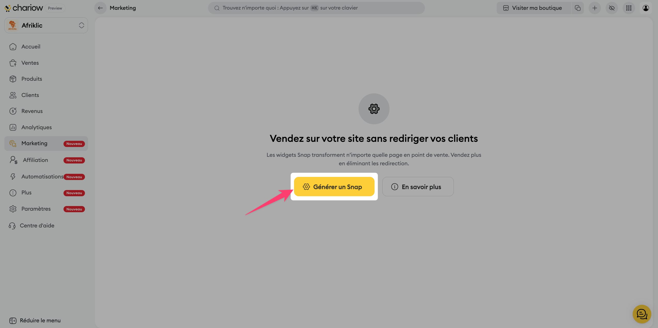 Pour y accéder dans votre interface Chariow, naviguez vers le menu latéral et cliquez sur Marketing, puis sélectionnez Snap.