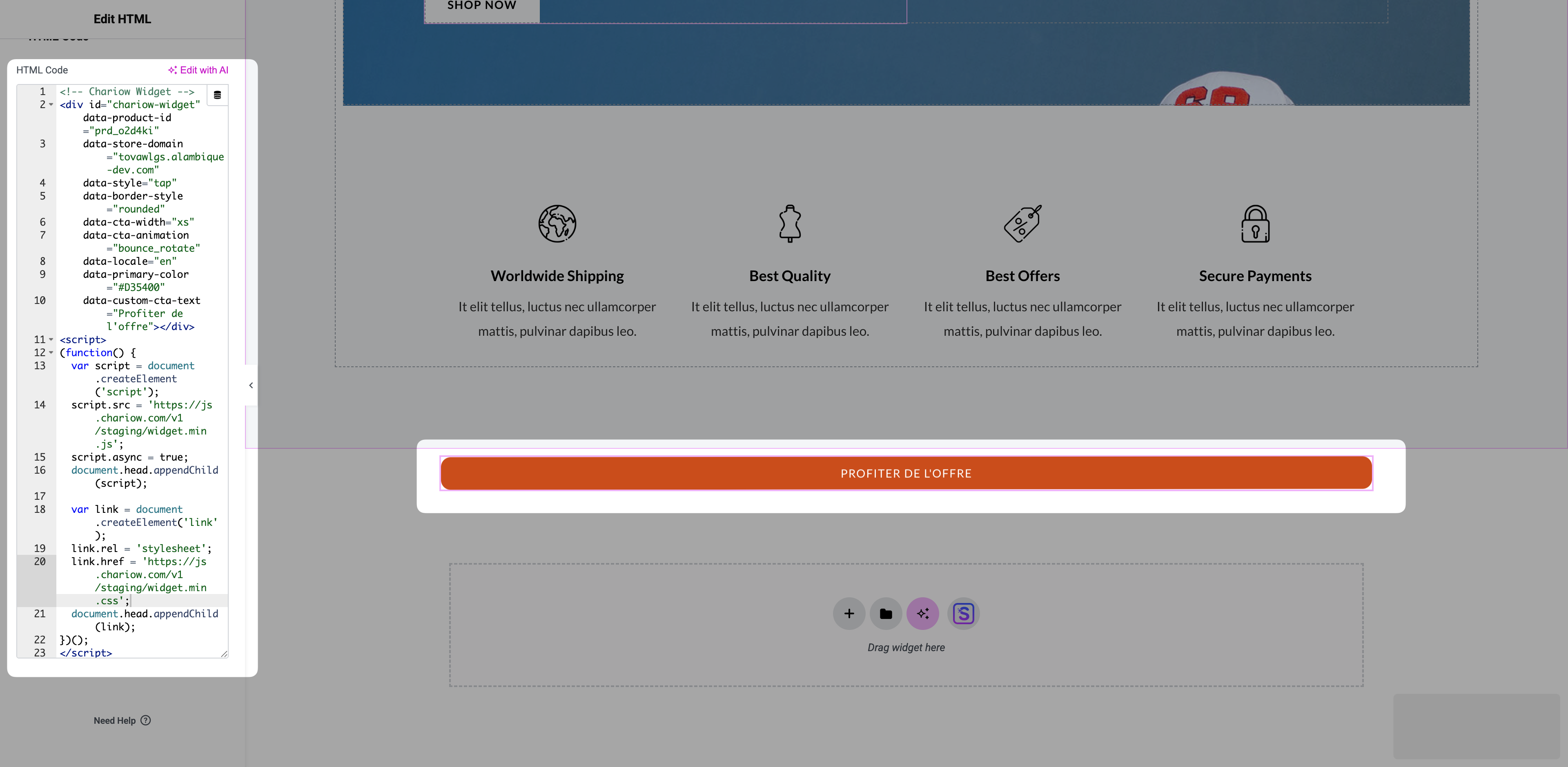 Vous devez avoir généré et copié le code HTML de votre widget 'Snap' (voir l'article : Snap : Intégrer un widget d'achat directement sur votre site).