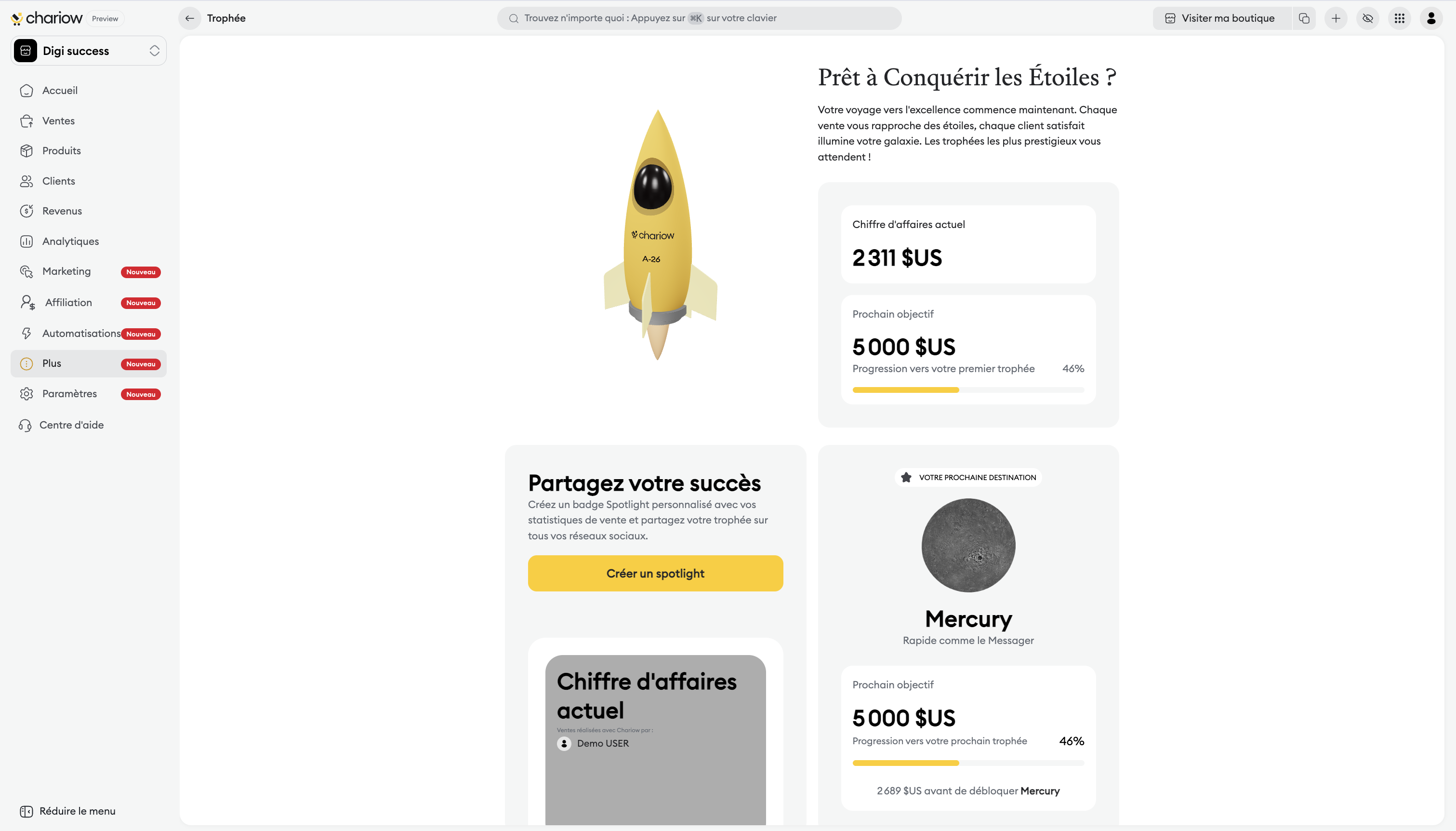 Chez Chariow, nous croyons que chaque vente vous rapproche des étoiles. La section "Trophée" suit votre progression en temps réel et vous récompense à mesure que vous franchissez des paliers de chiffre d'affaires prédéfinis. C'est un outil de motivation puissant pour visualiser votre succès et débloquer des avantages exclusifs.