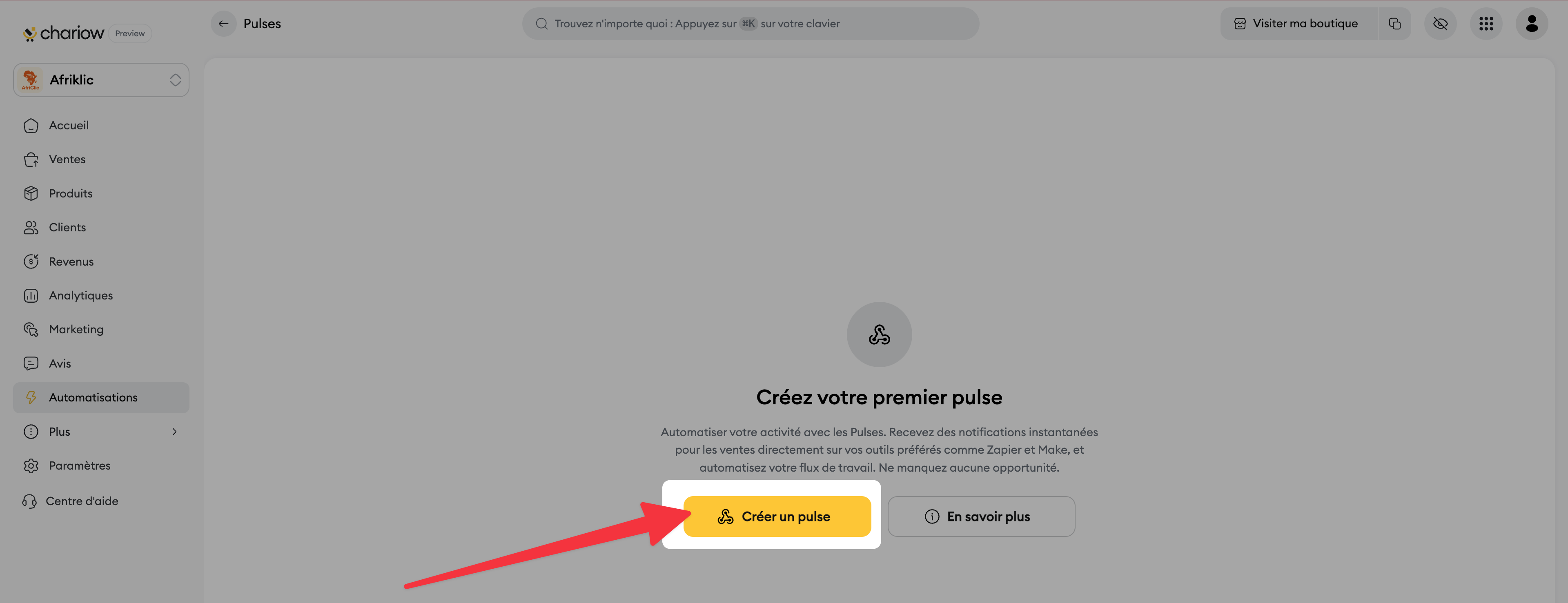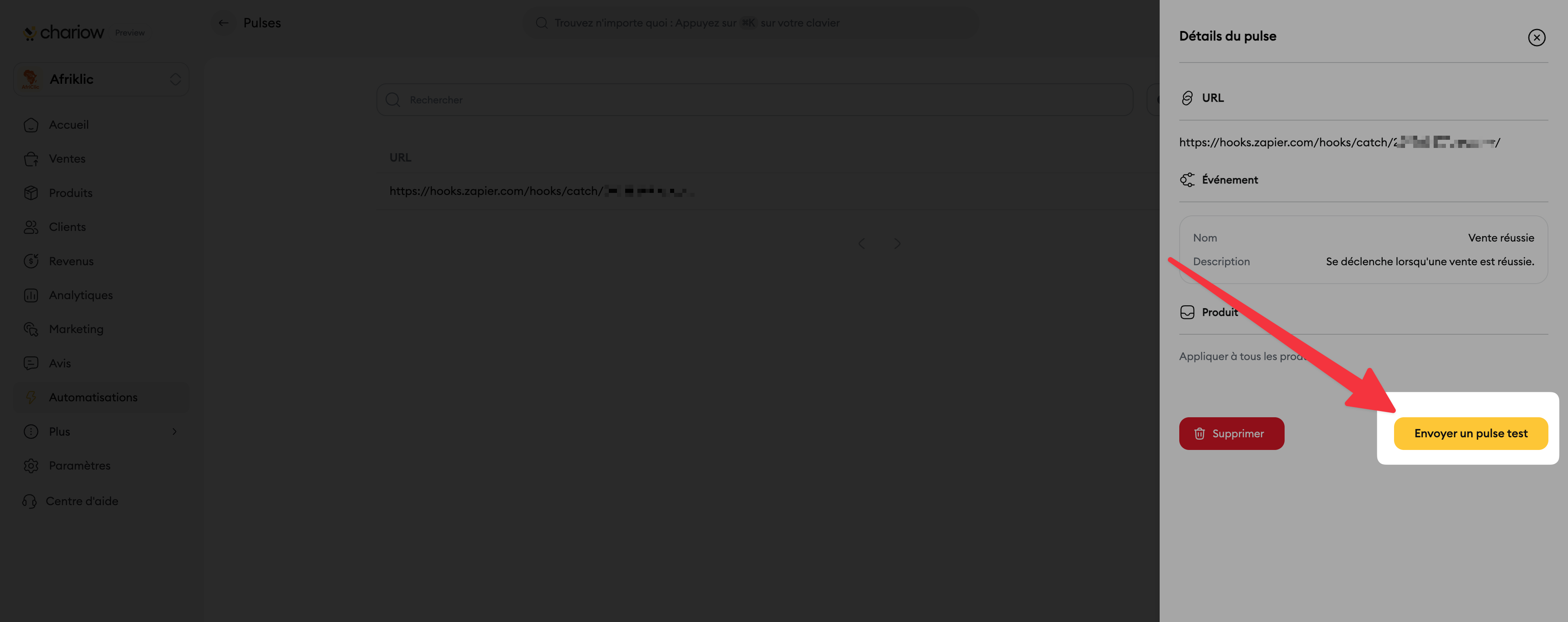 Dans la liste de vos Pulses sur Chariow, cliquez sur le pulse que vous venez de créer.