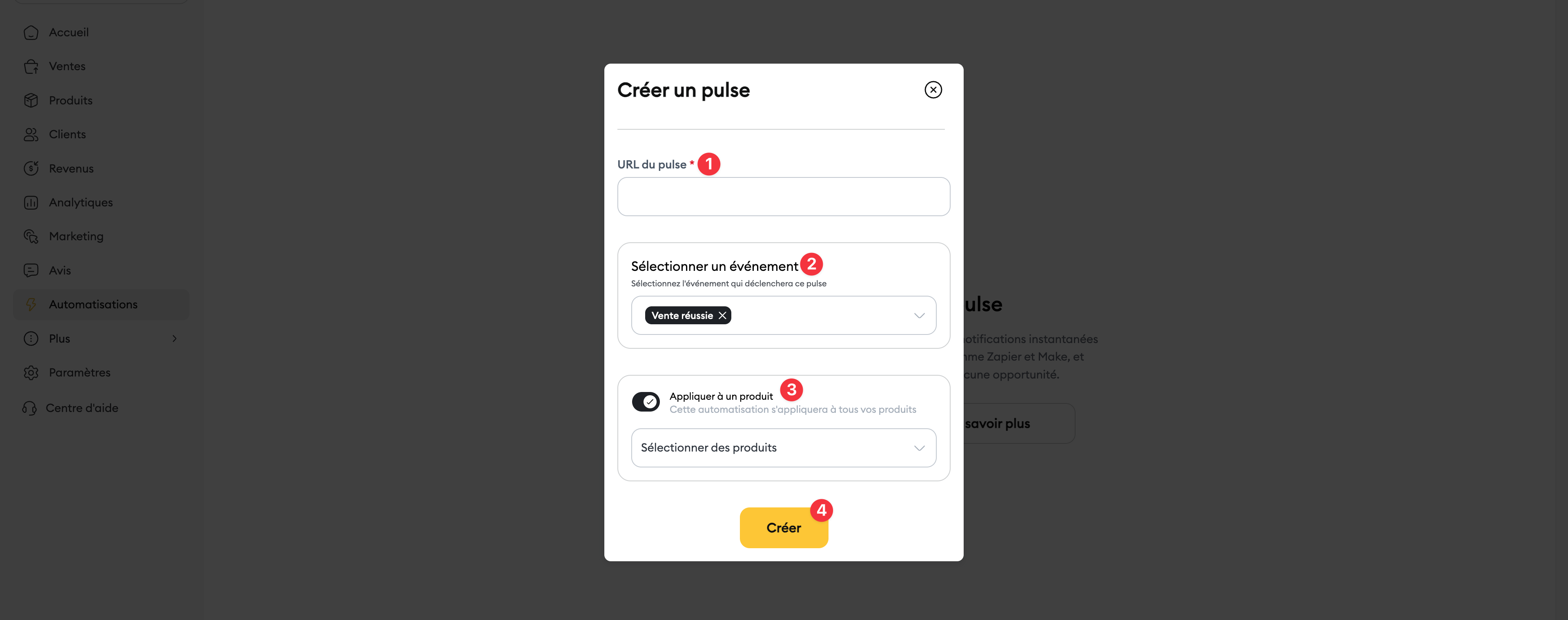 Sélectionnez l'événement déclencheur de votre choix (ex: "Vente réussie", "Vente échouée").