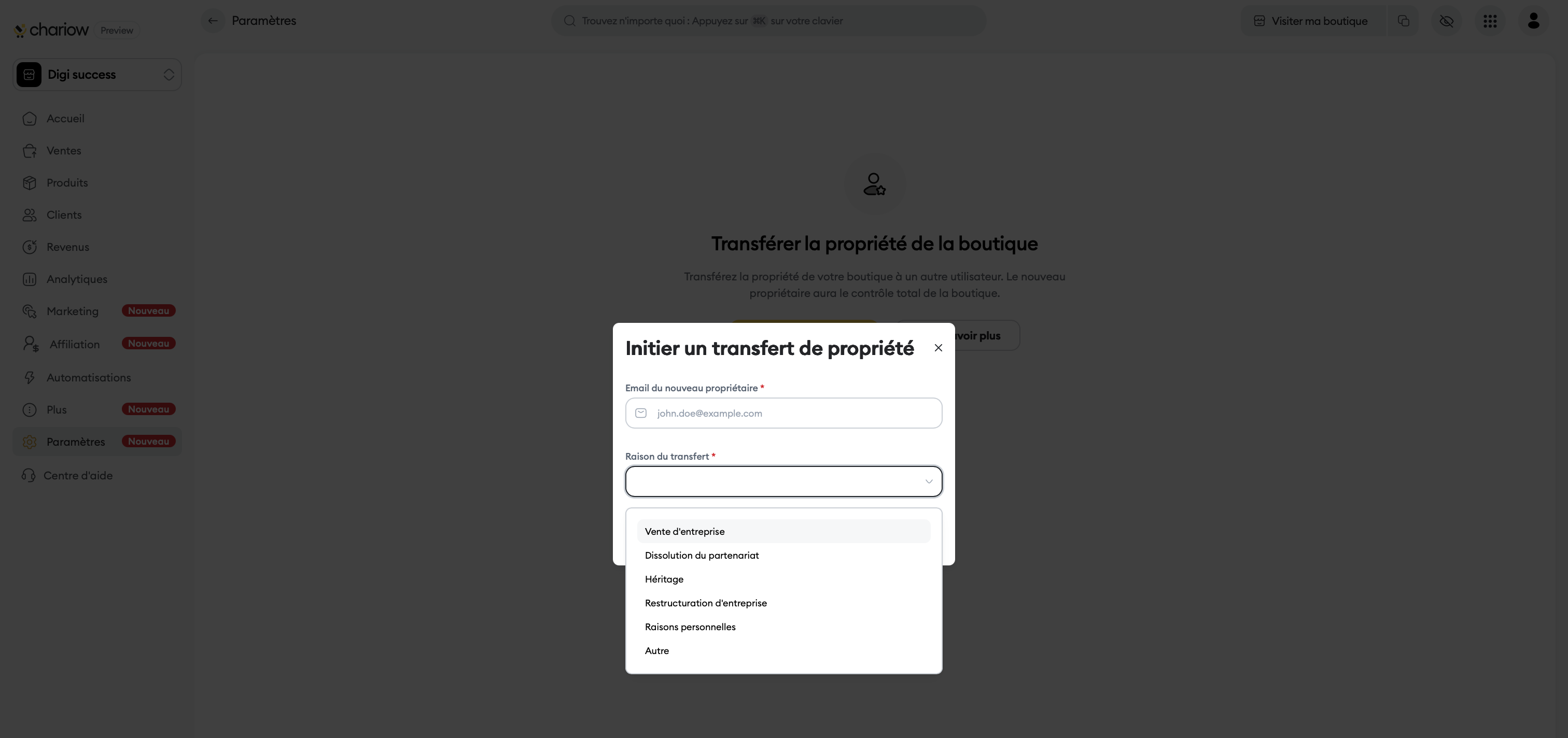Email du nouveau propriétaire : Saisissez l'adresse email de la personne qui recevra la boutique.