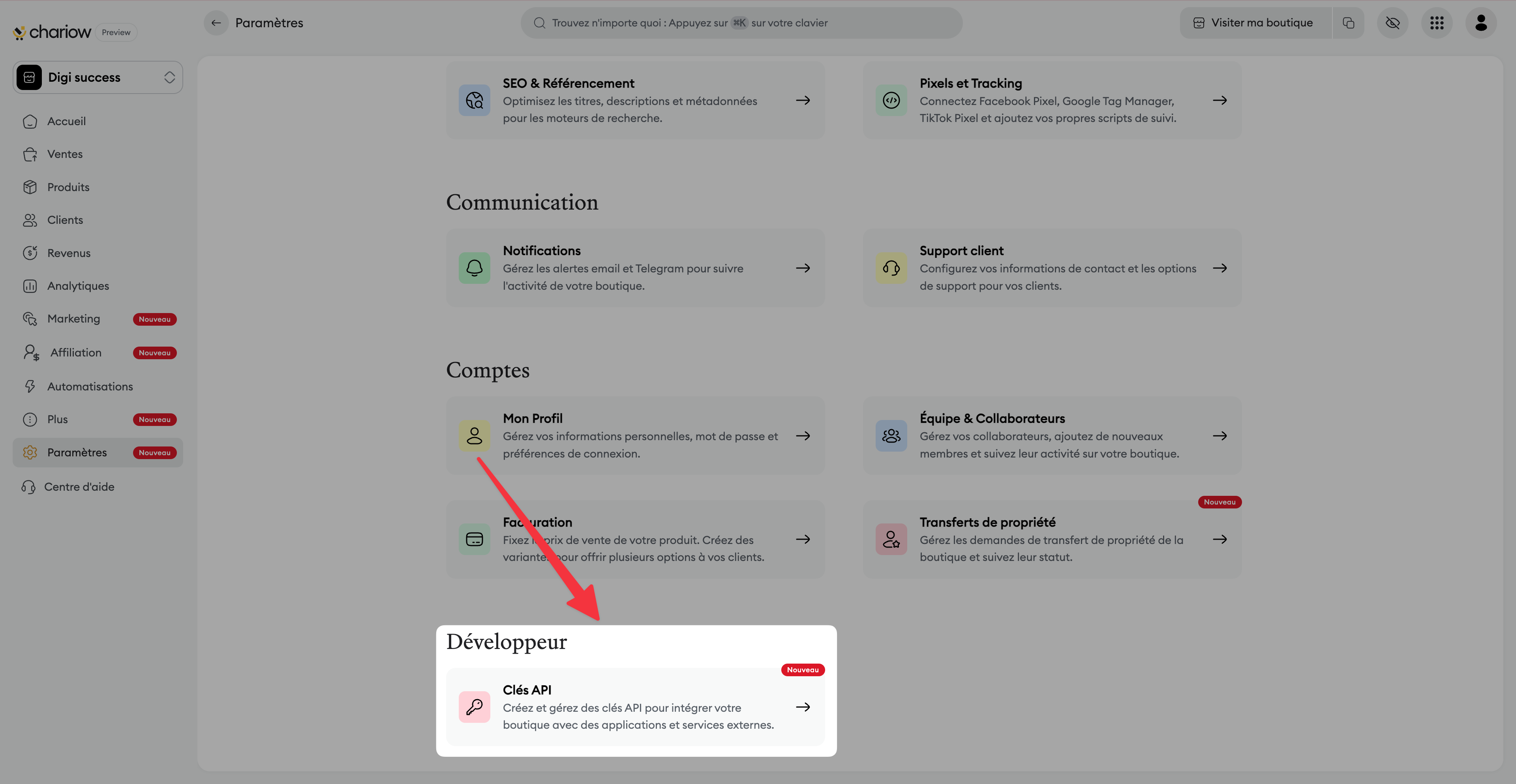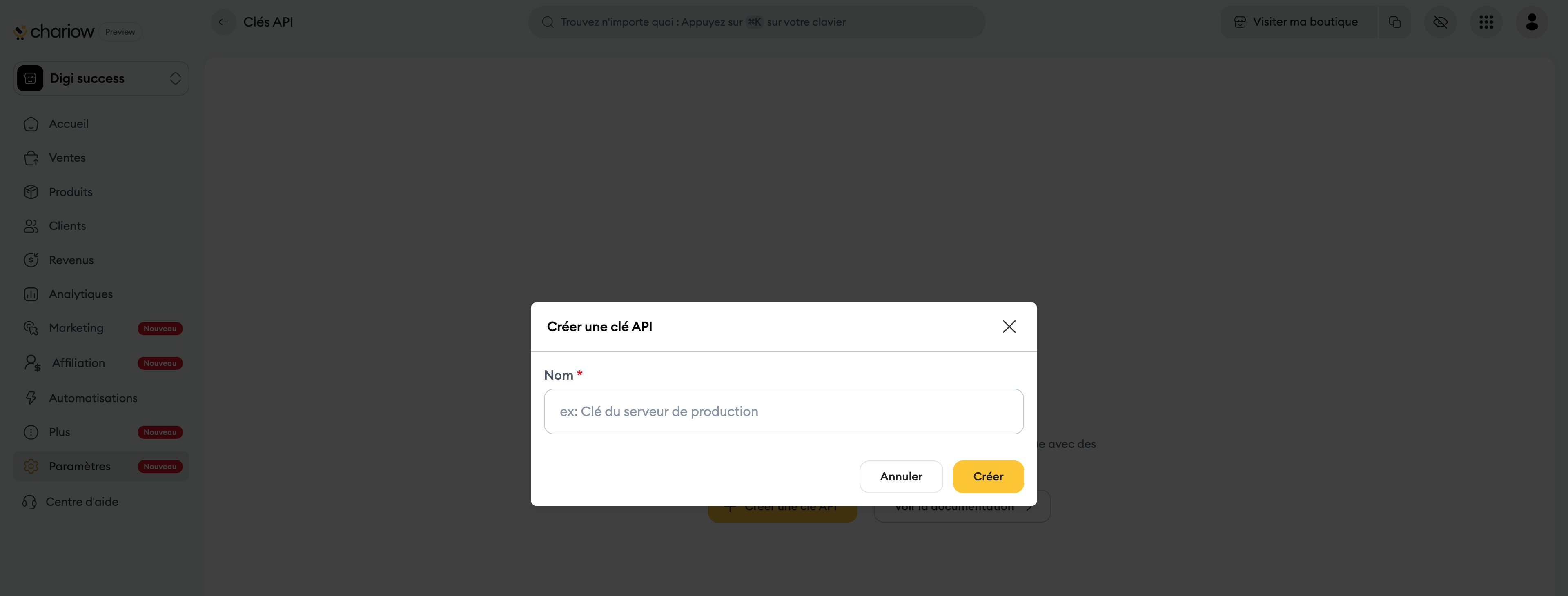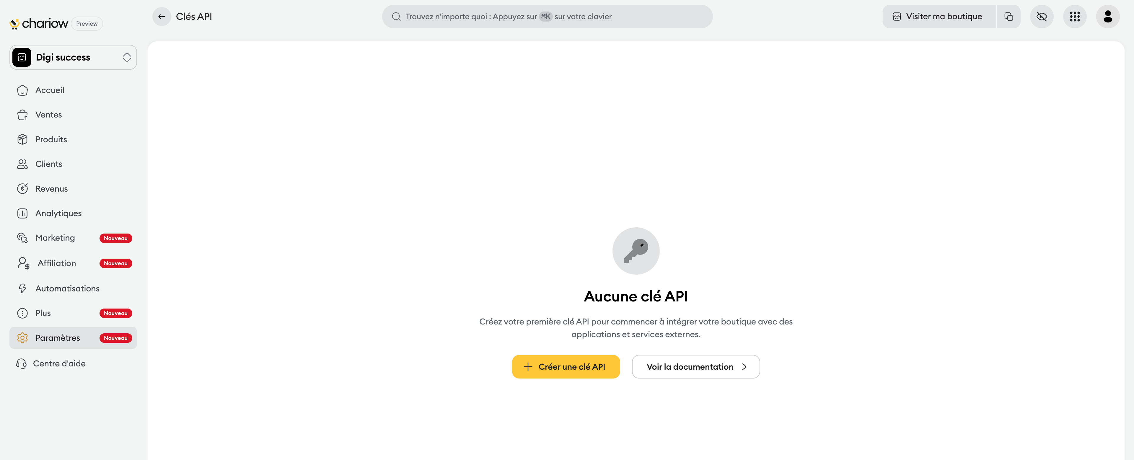 Les Clés API permettent de connecter votre boutique à des outils tiers (comme des plateformes d'automatisation ou des services de statistiques) de manière sécurisée. Elles servent d'identifiant pour autoriser ces services à communiquer avec vos données Chariow.