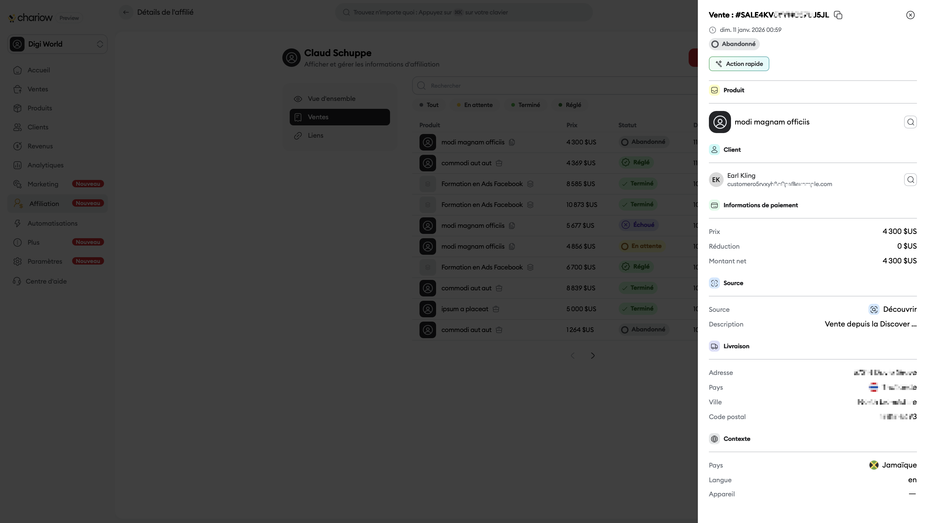 Fiche de vente : En cliquant sur une vente, un volet latéral s'ouvre pour afficher les informations client, le montant net, la source du trafic et les détails de livraison.
