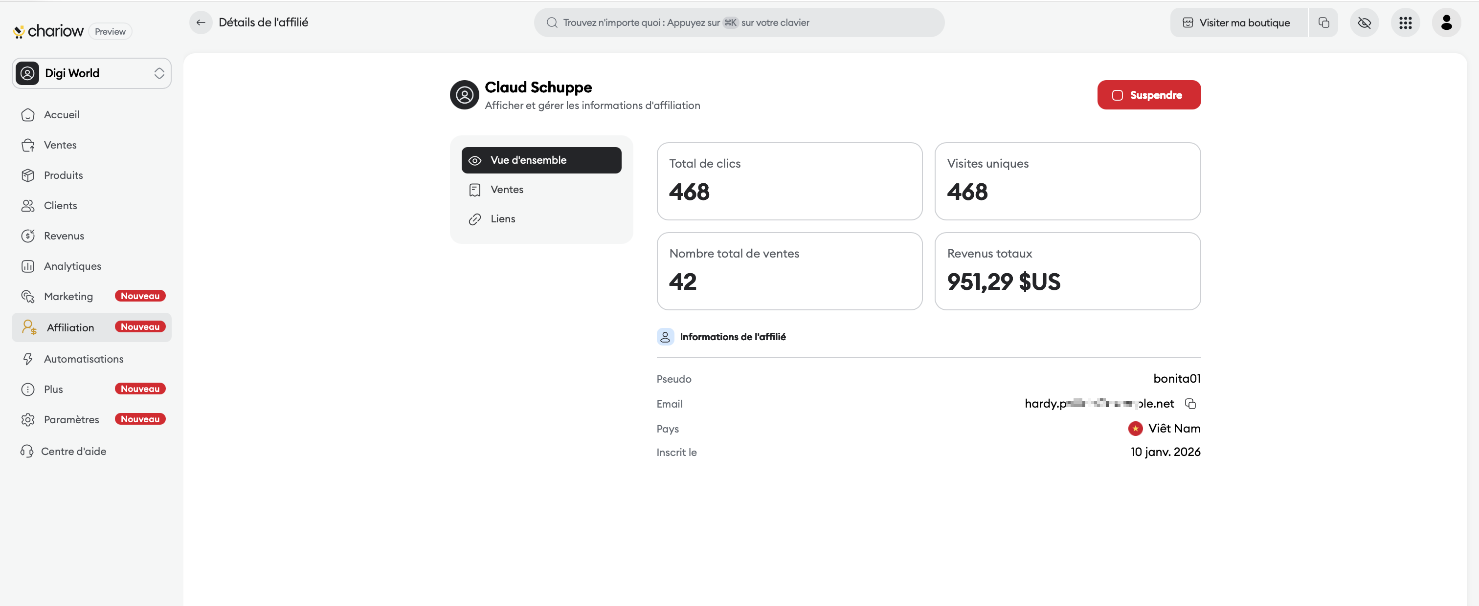 Informations de l'affilié : Retrouvez son pseudo, son email, son pays d'origine et sa date d'inscription.
