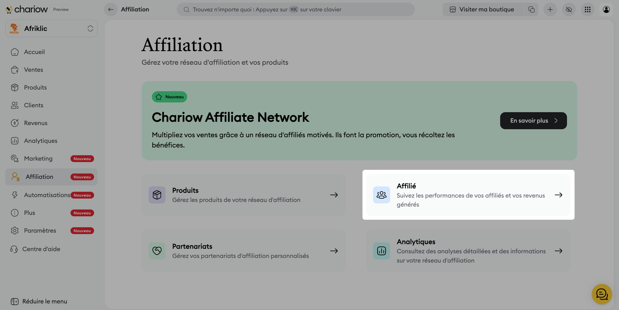 Dans le menu principal, cliquez sur "Affiliation" puis sur le bloc "Affilié".