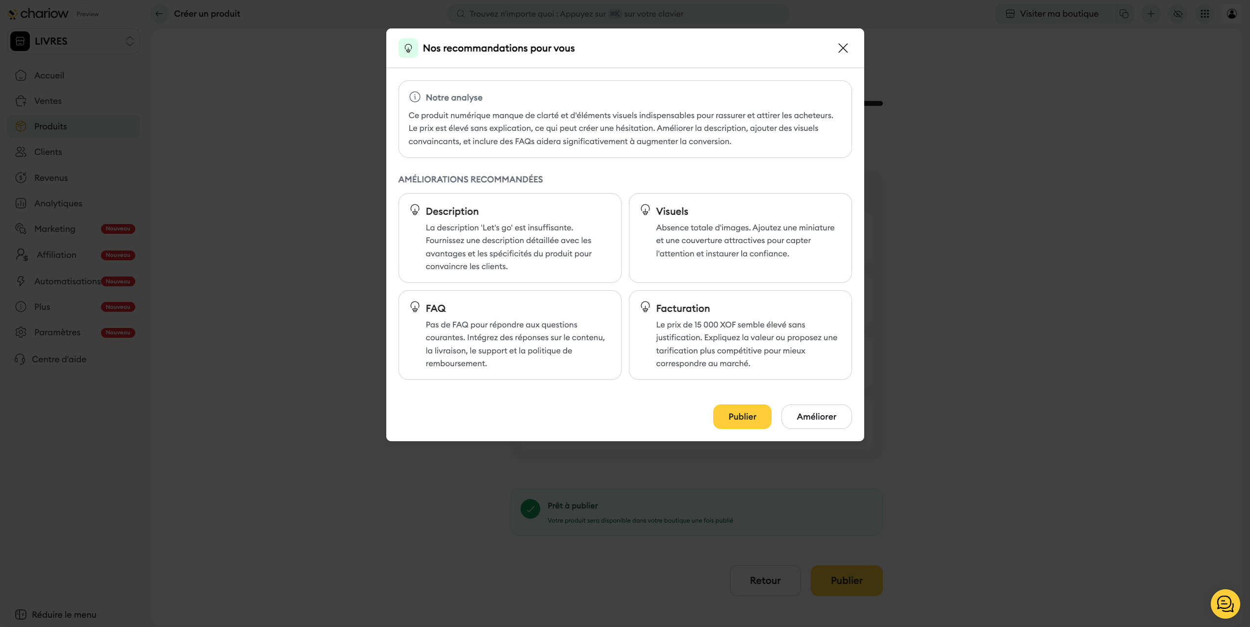 Action finale : Cliquez sur Améliorer pour suivre les conseils de l'IA, ou sur Publier pour rendre le produit disponible immédiatement.