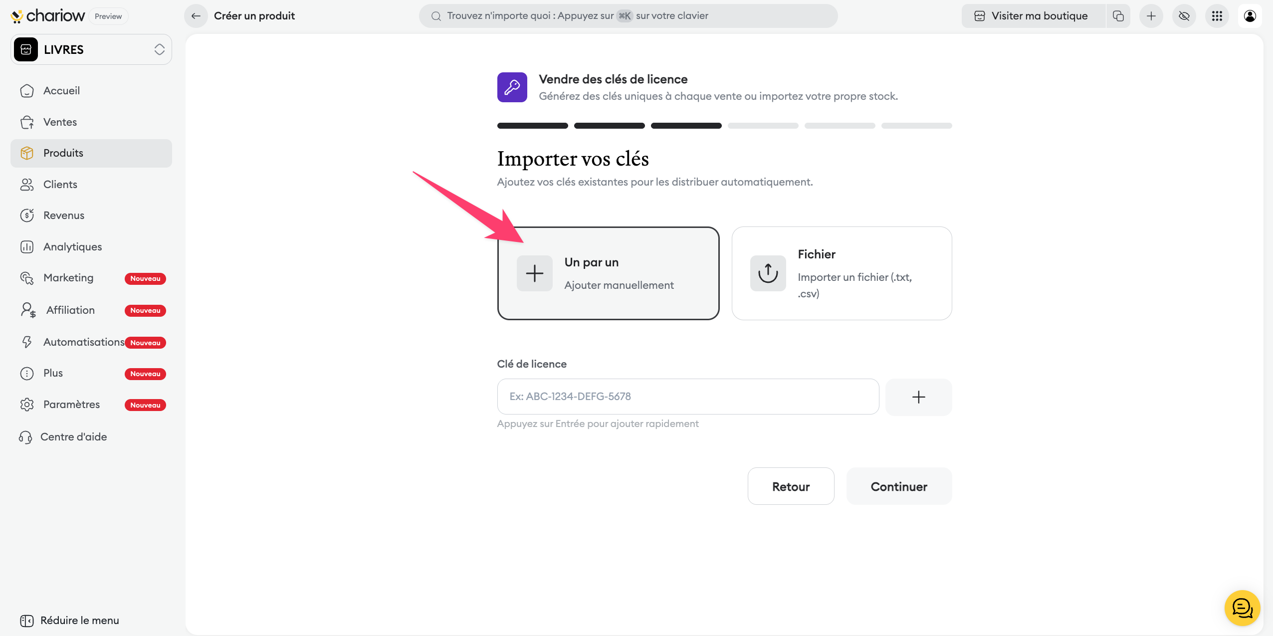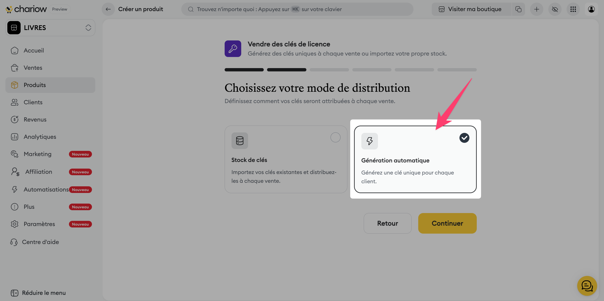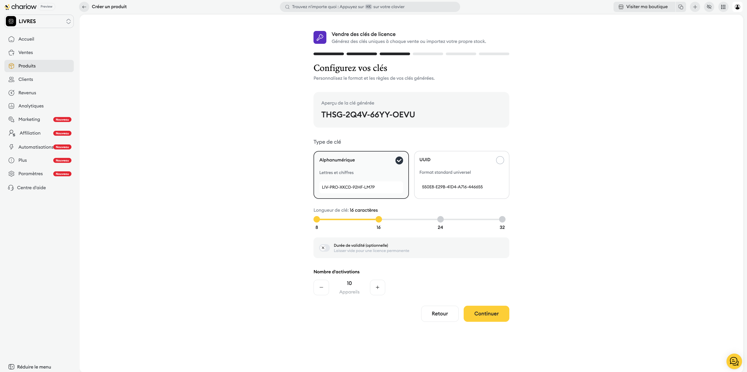 Génération automatique : Chariow crée les clés pour vous selon vos critères.