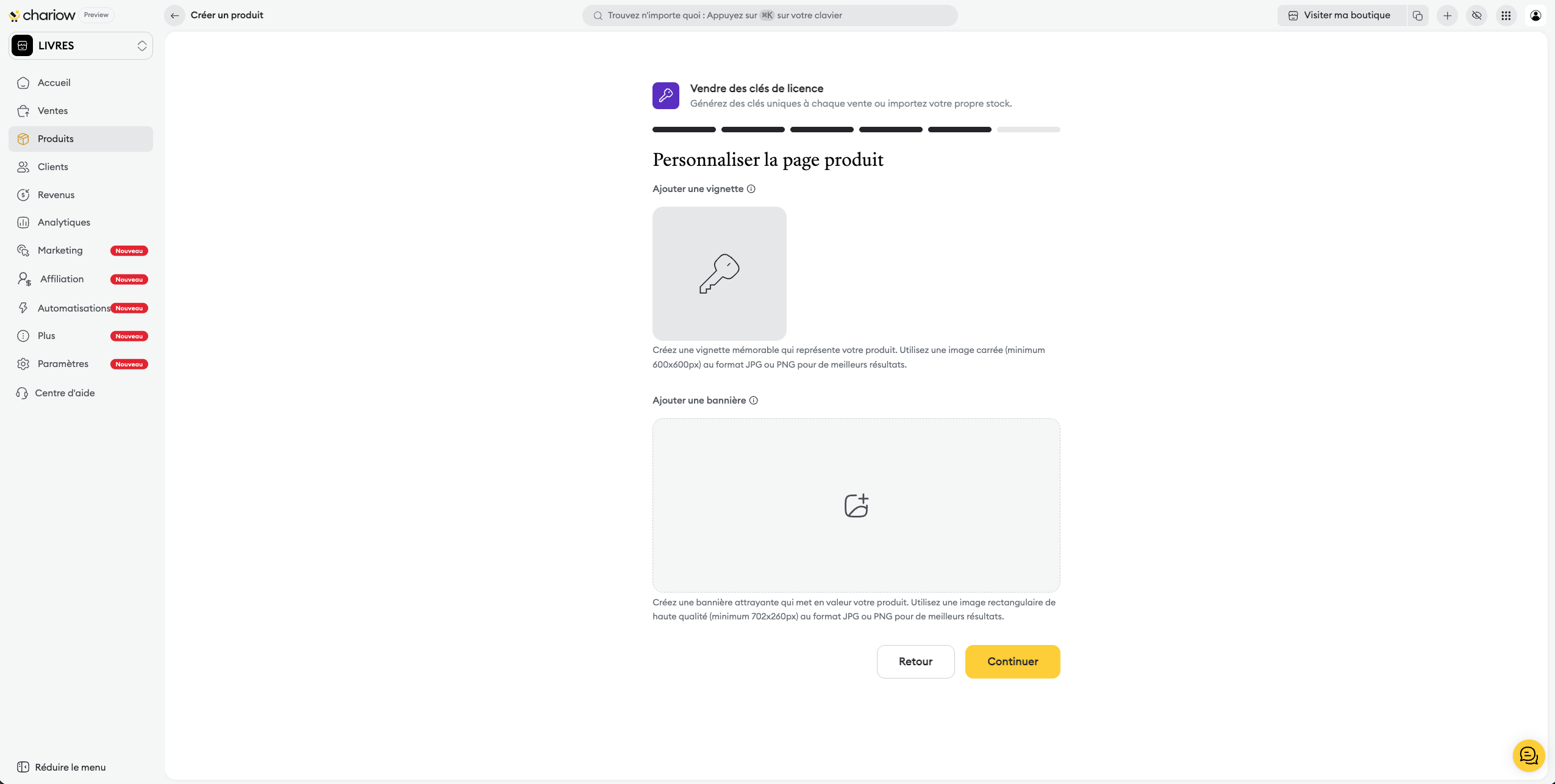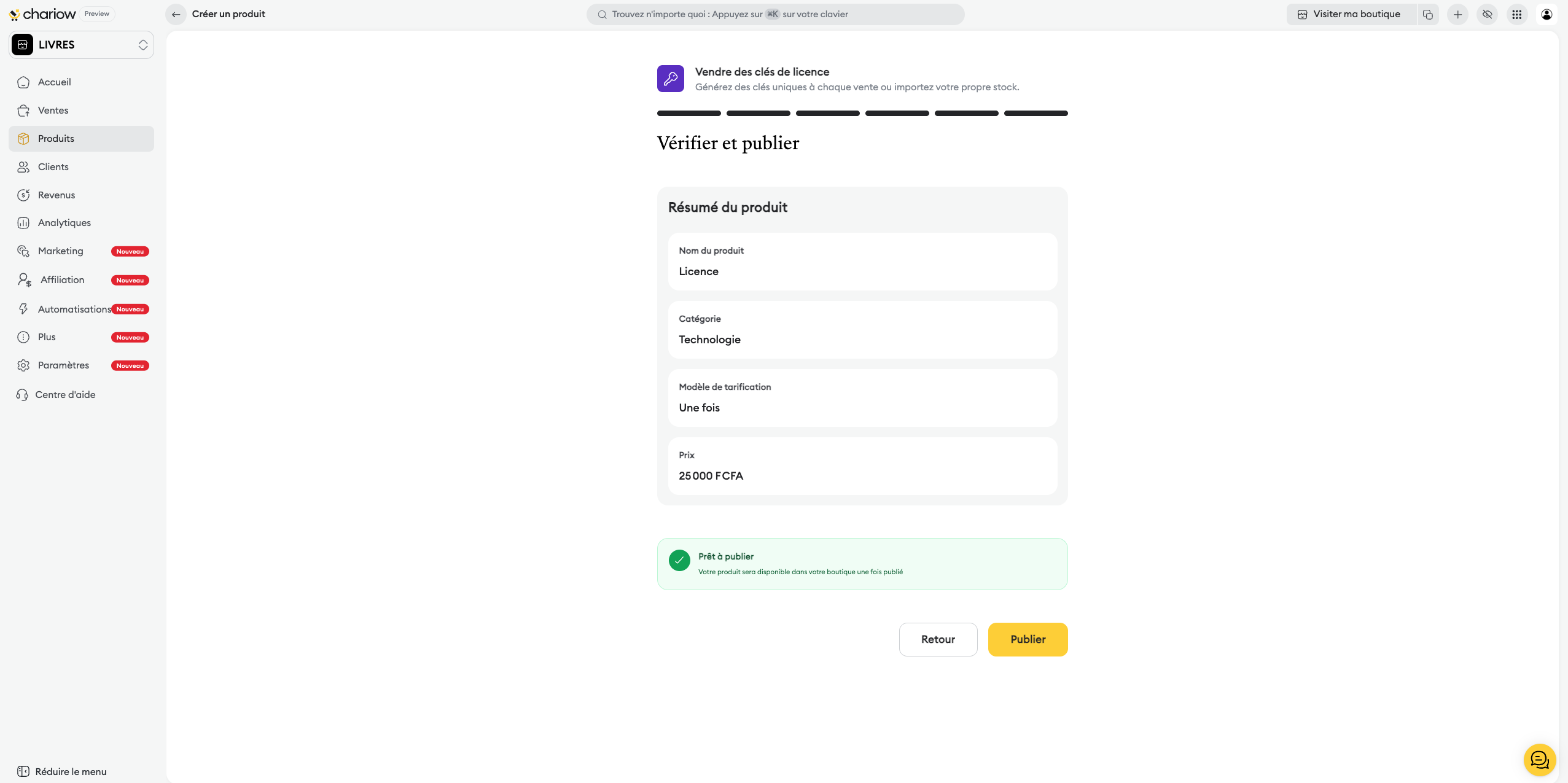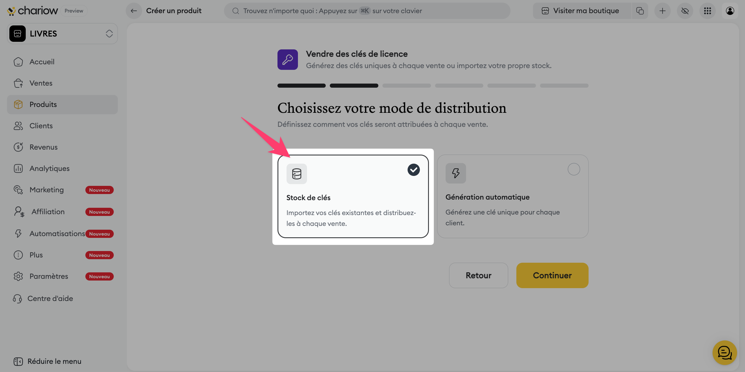 Génération automatique : Chariow crée les clés pour vous selon vos critères.