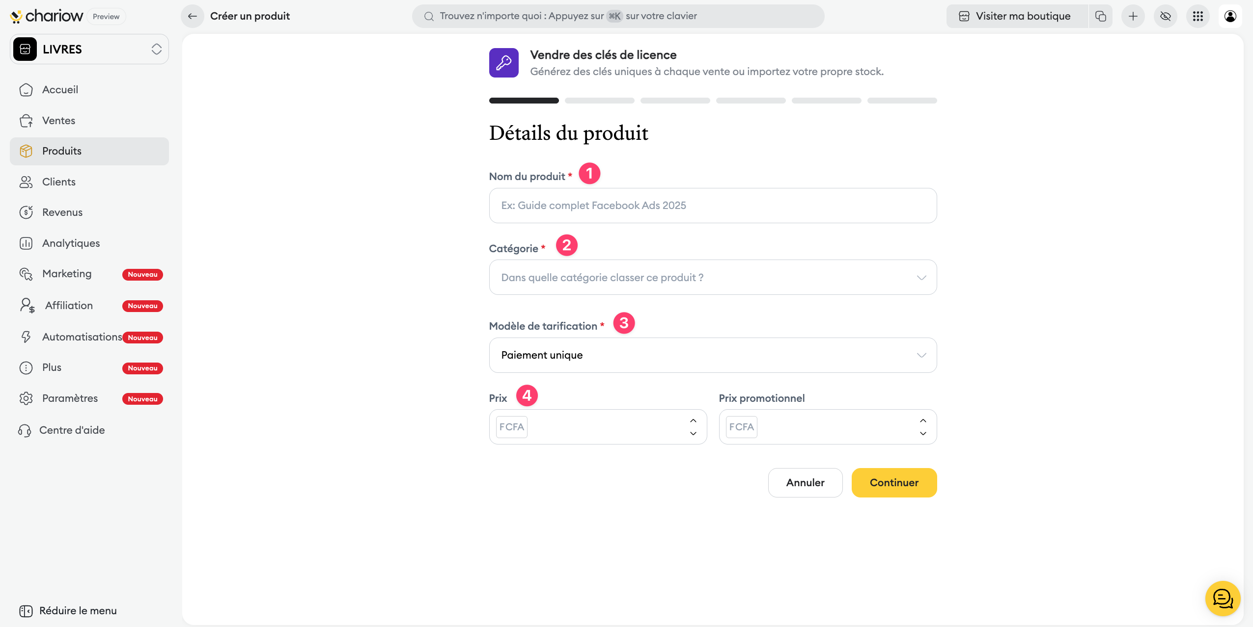 Génération automatique : Chariow peut créer des clés uniques pour chaque vente.