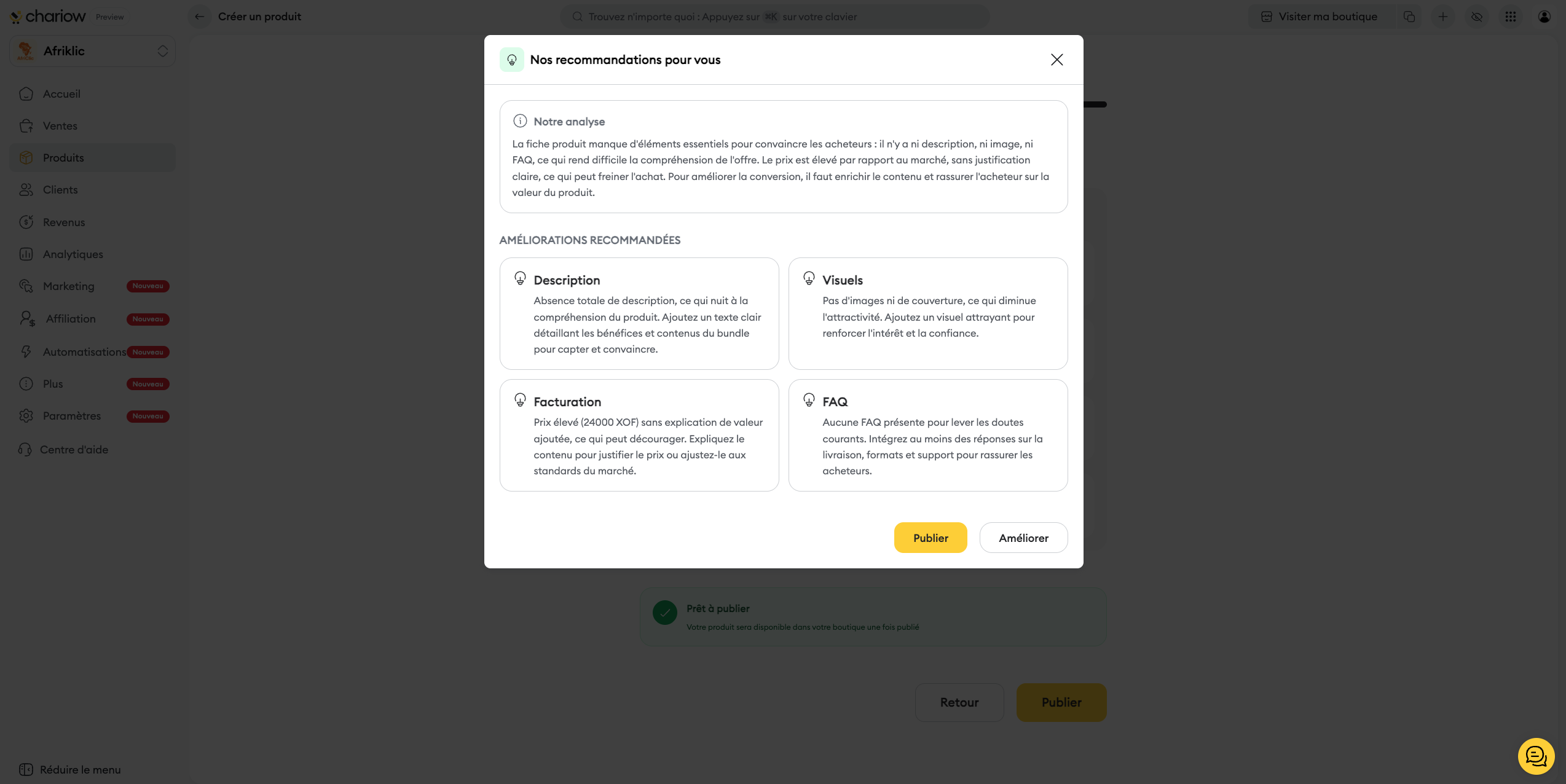 Action finale : cliquez sur Améliorer pour suivre les conseils de l'IA, ou sur Publier quand même pour rendre le bundle disponible immédiatement.