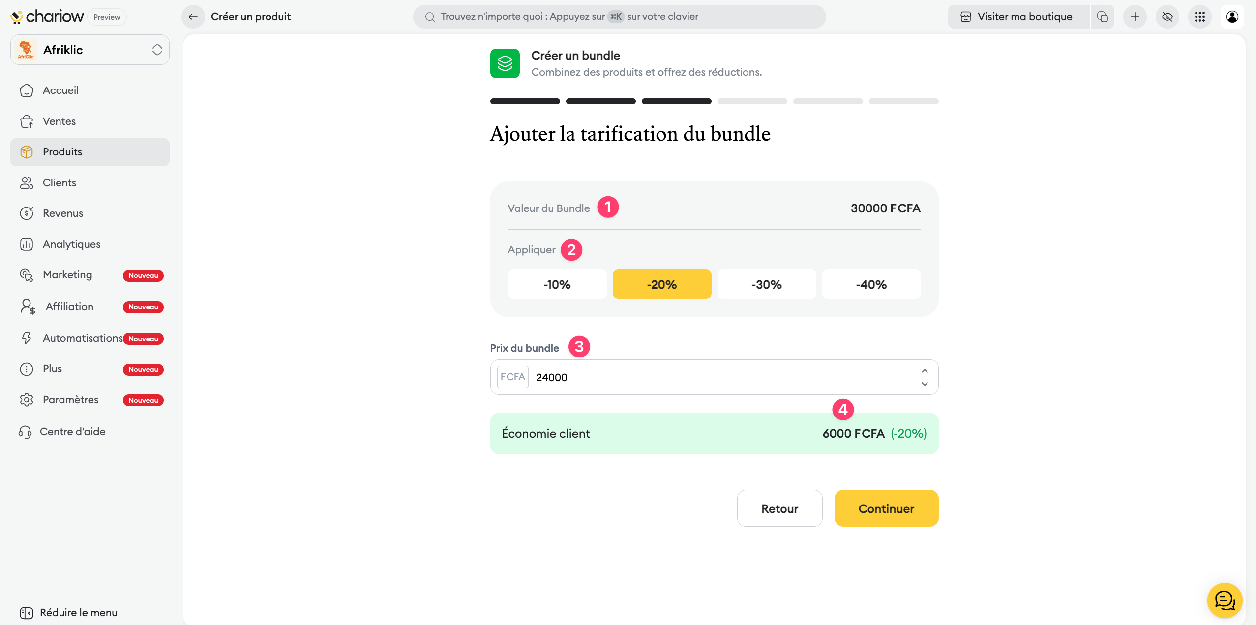 Prix du bundle : vous pouvez également saisir manuellement le prix final souhaité. Le système calculera et affichera automatiquement le pourcentage de réduction correspondant.