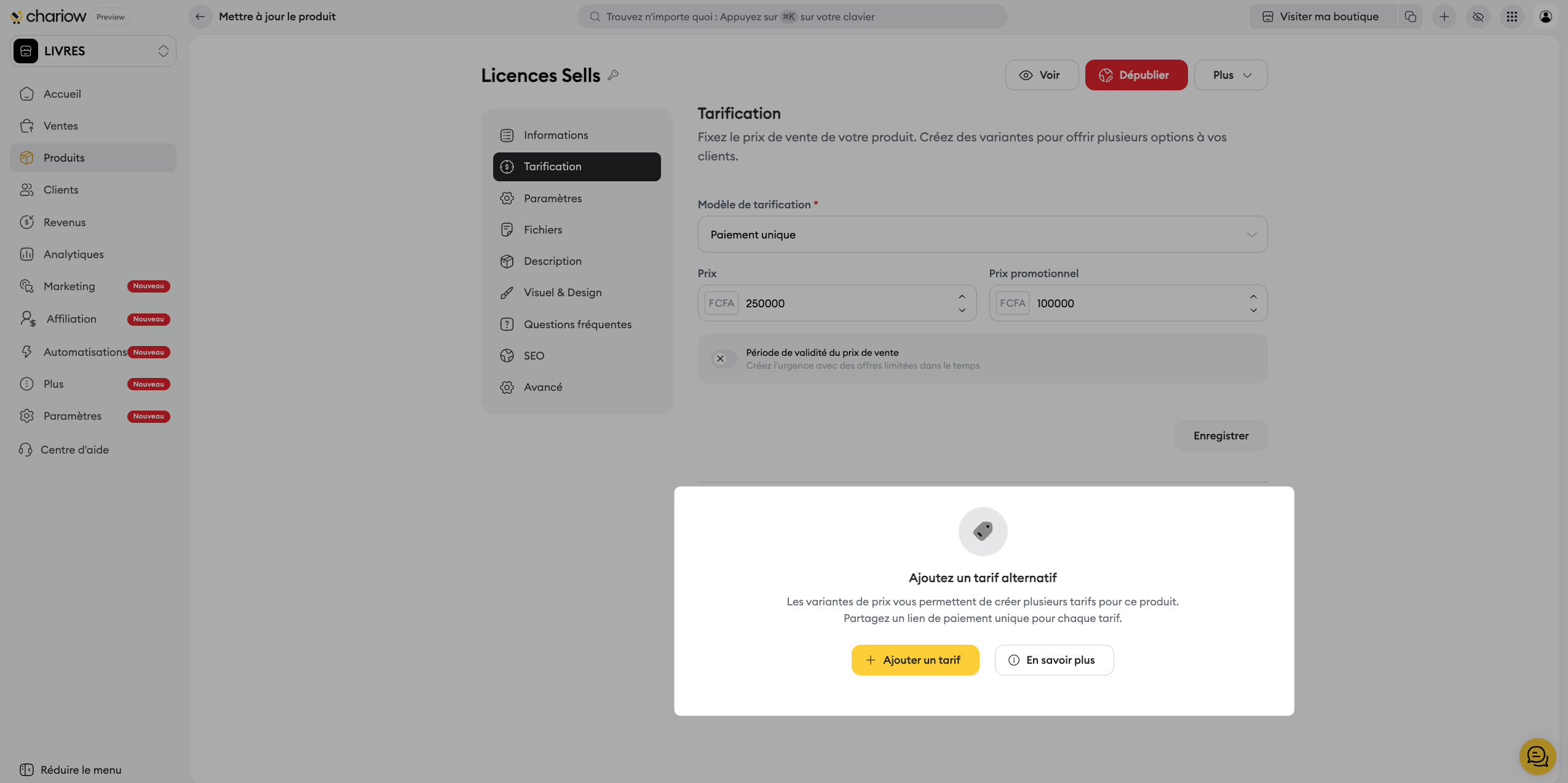 Ajouter une variante : Créez différents paliers de prix pour votre licence.