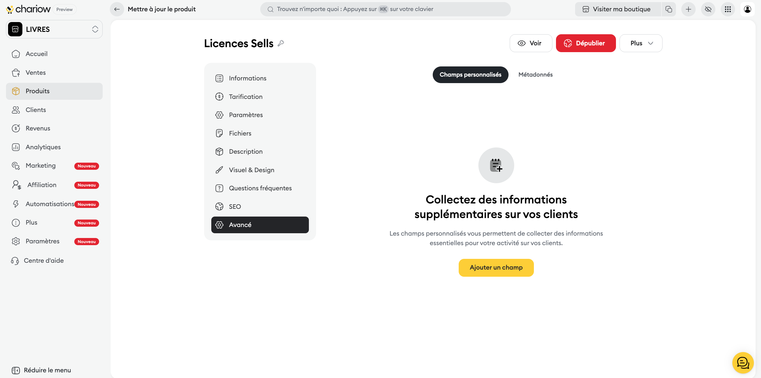 Une fois votre produit de type licence créé, Chariow vous offre un panneau de contrôle complet pour gérer la distribution, la sécurité et l'identité commerciale de vos clés.