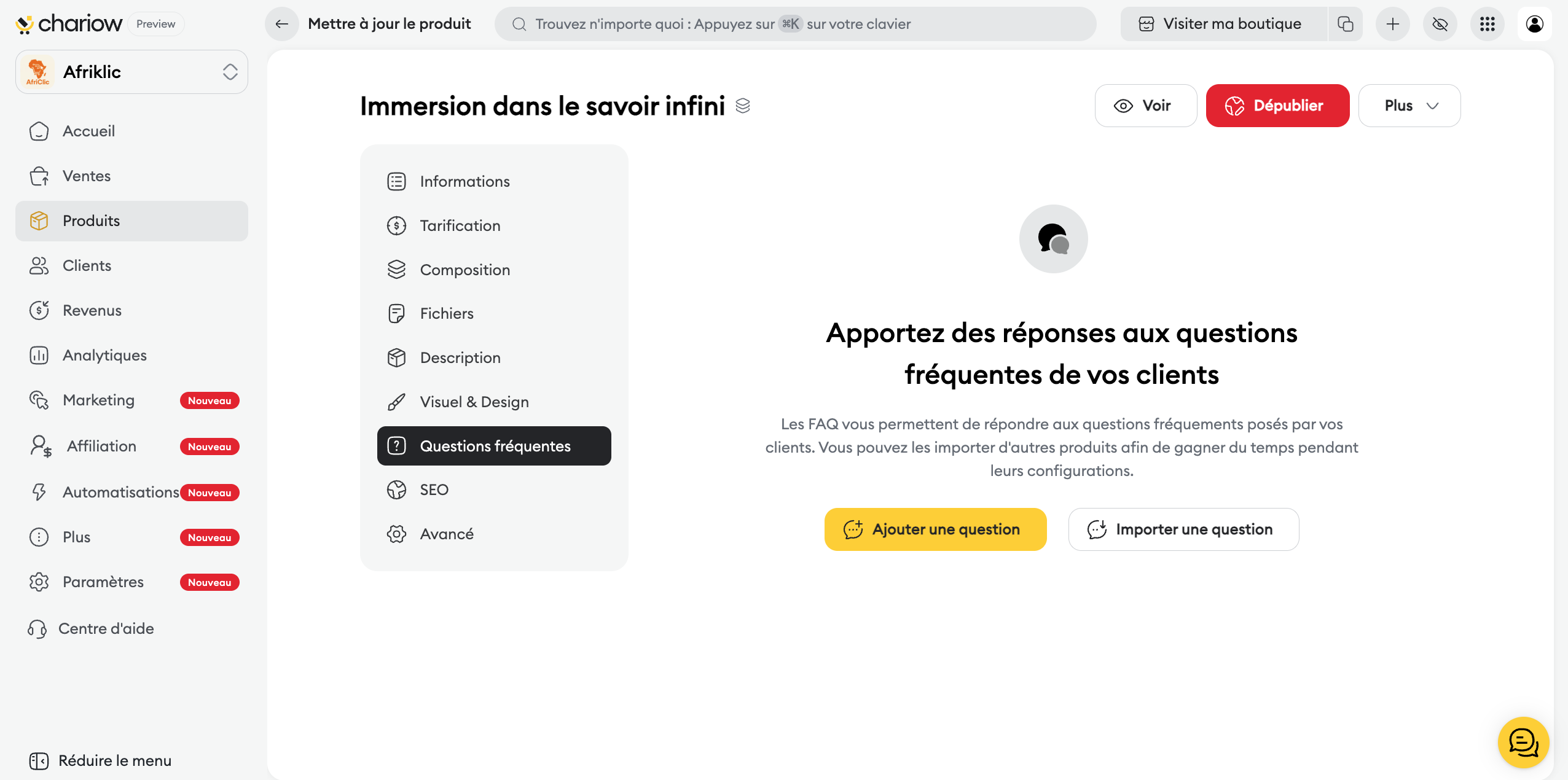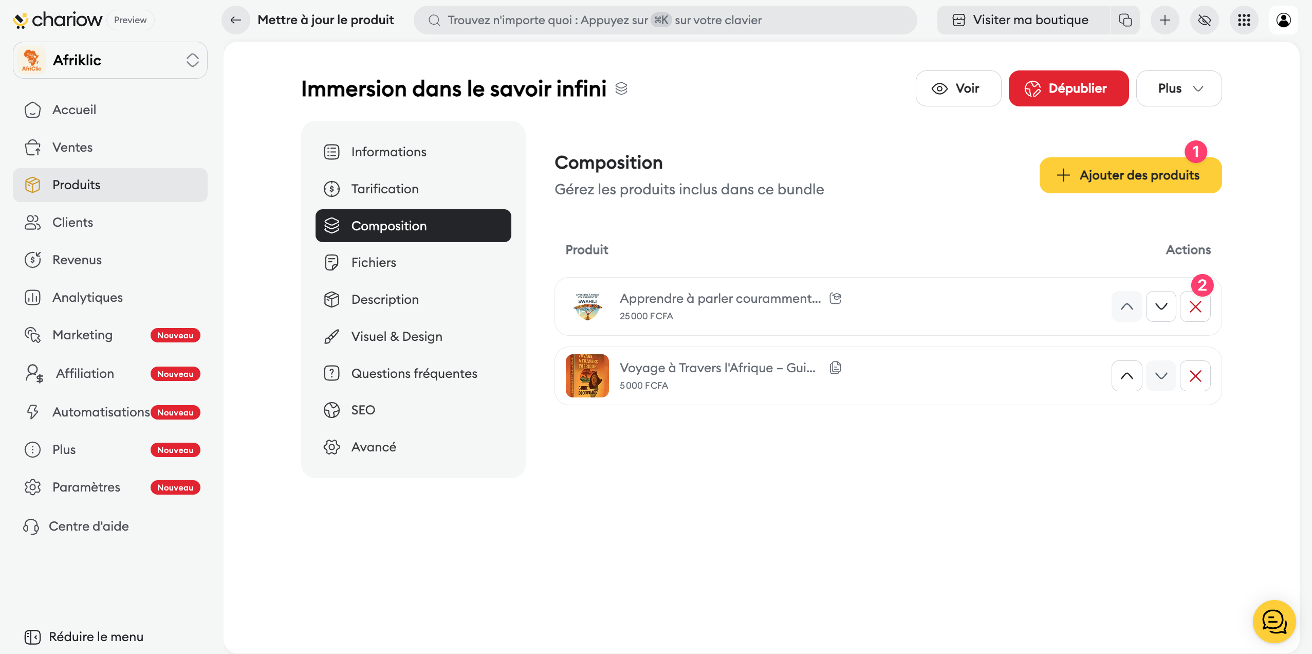 Une fois votre Bundle créé, Chariow vous permet d'accéder à un panneau de contrôle complet pour gérer sa composition, sa visibilité et sa sécurité.