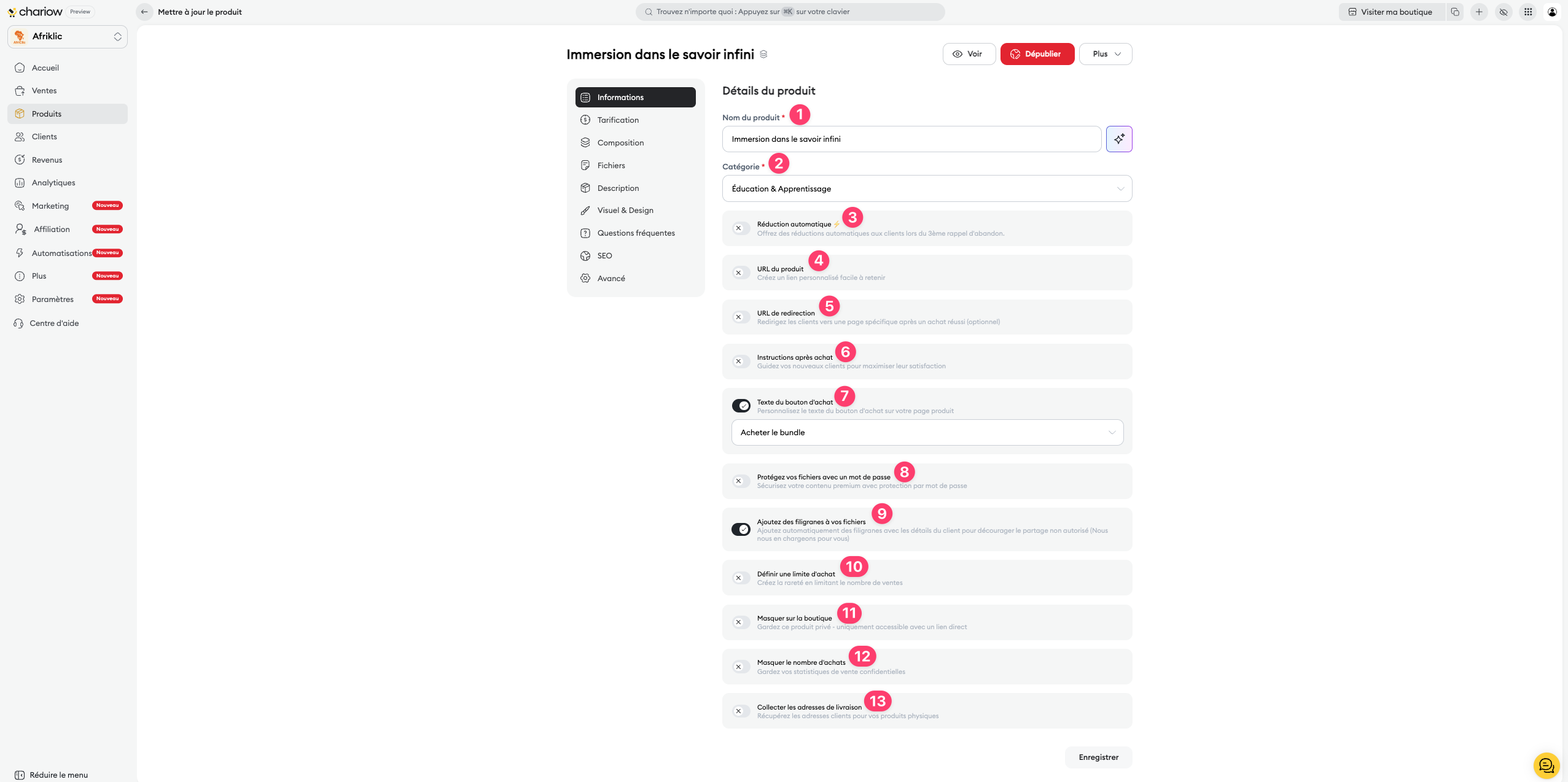 URL personnalisée (4) : Créez un lien unique et facile à retenir pour promouvoir votre bundle sur les réseaux sociaux.