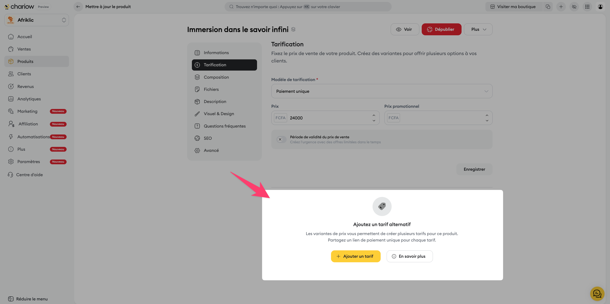 Plusieurs tarifs : Créez des variantes de prix (ex: "Pack Standard" vs "Pack Premium avec coaching").