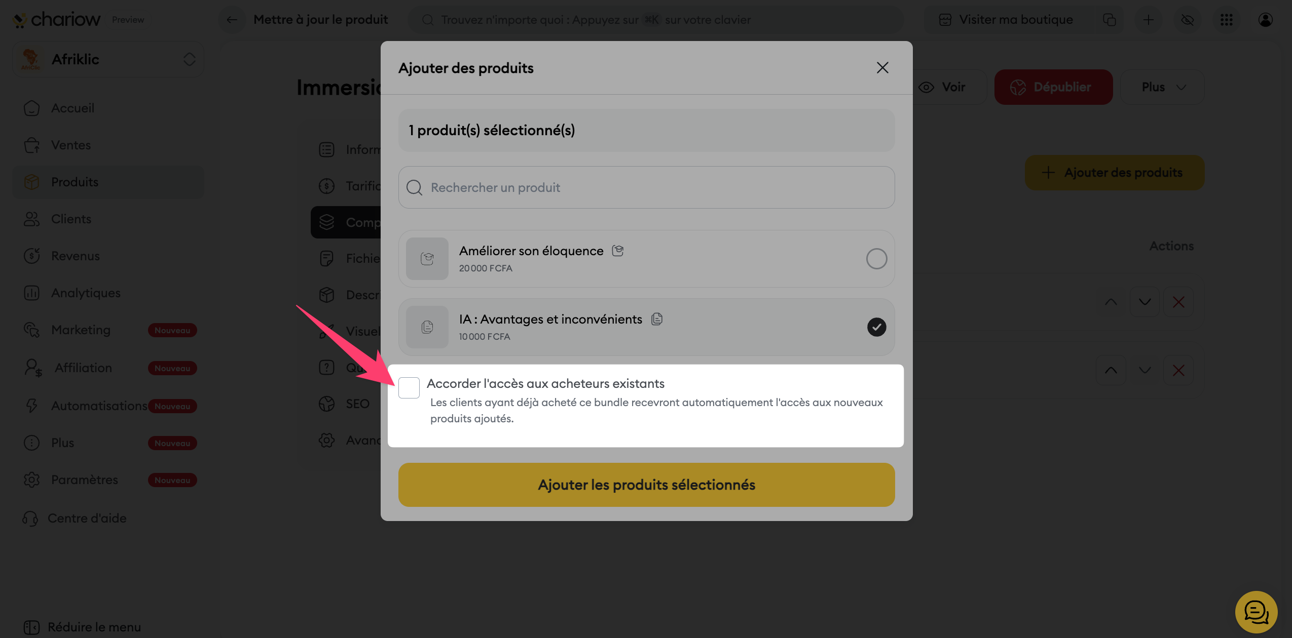 Accès aux acheteurs existants : Vous pouvez choisir d'accorder automatiquement l'accès aux nouveaux produits ajoutés aux clients ayant déjà acheté ce bundle.