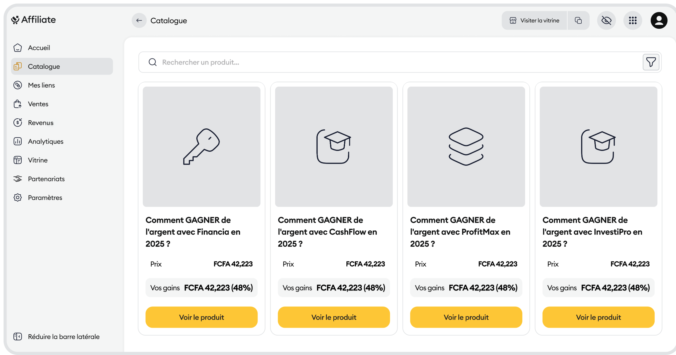 Analyse des gains : Sur chaque vignette, visualisez le prix du produit et le montant exact que "Vous gagnez".