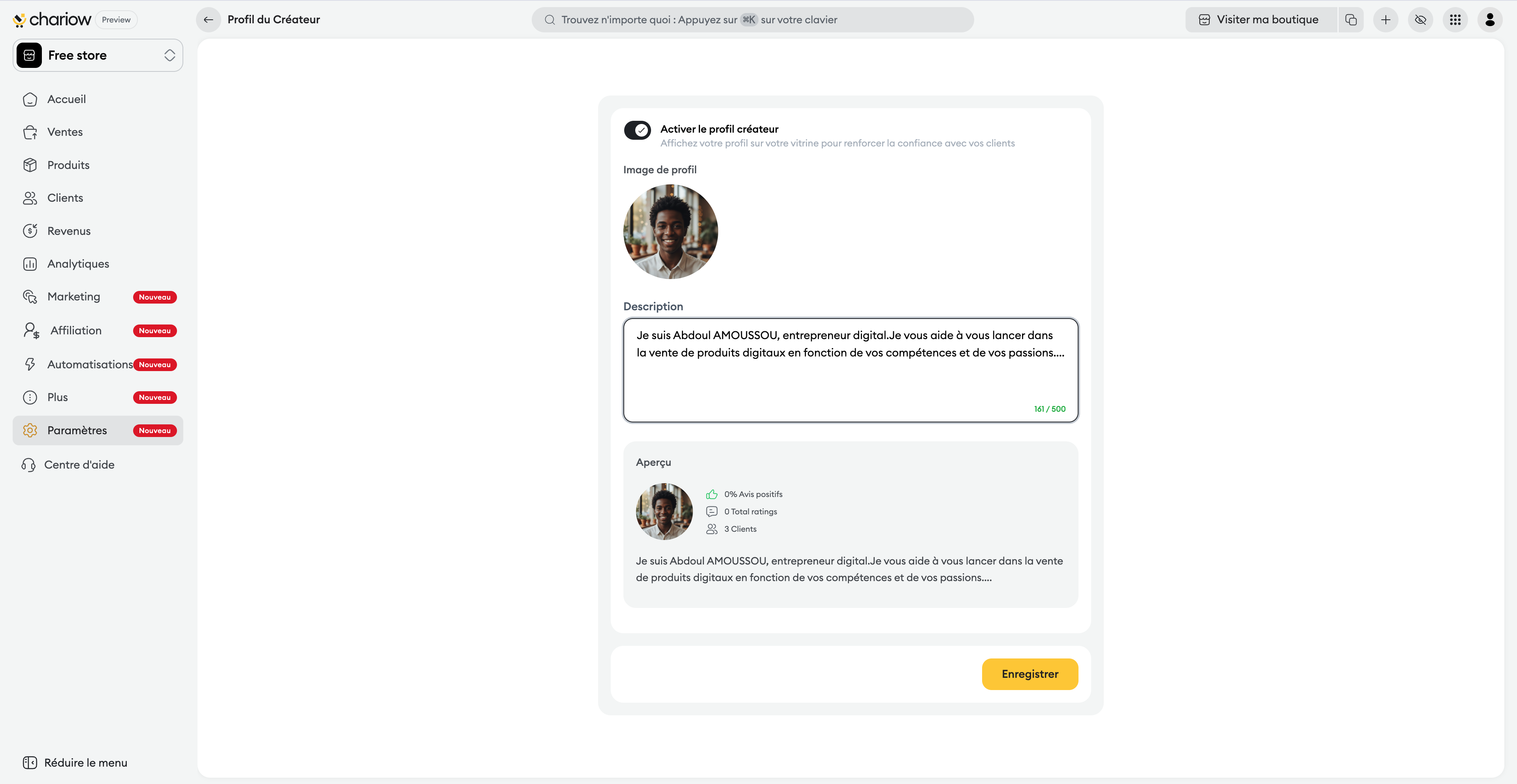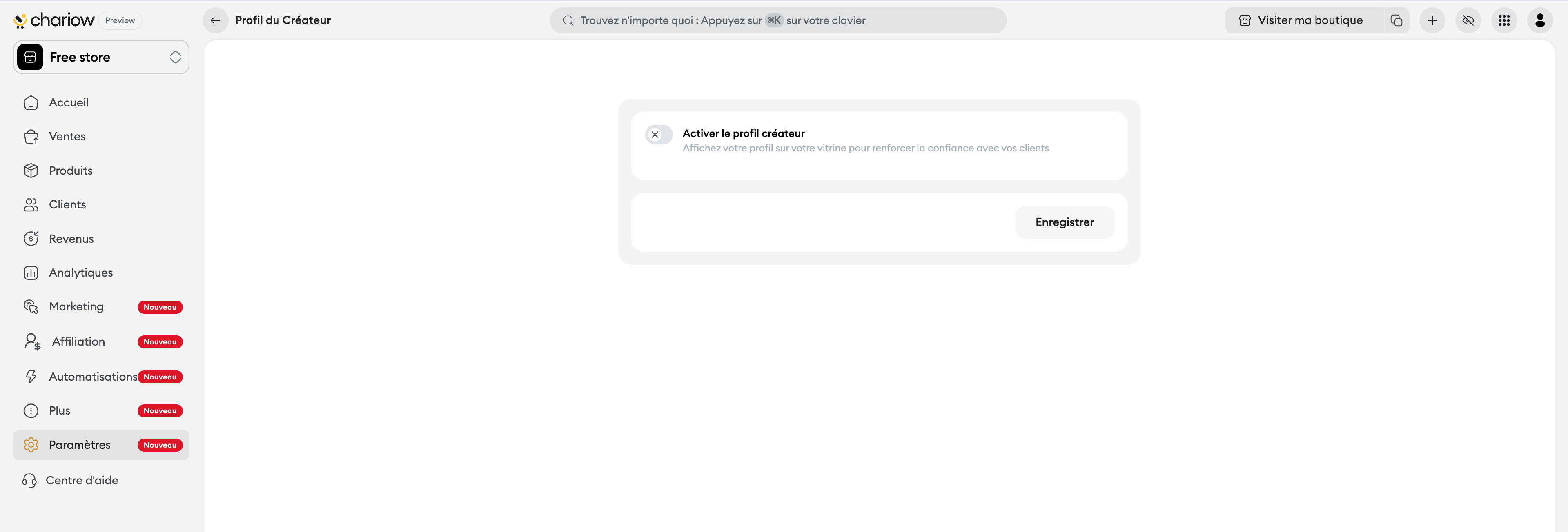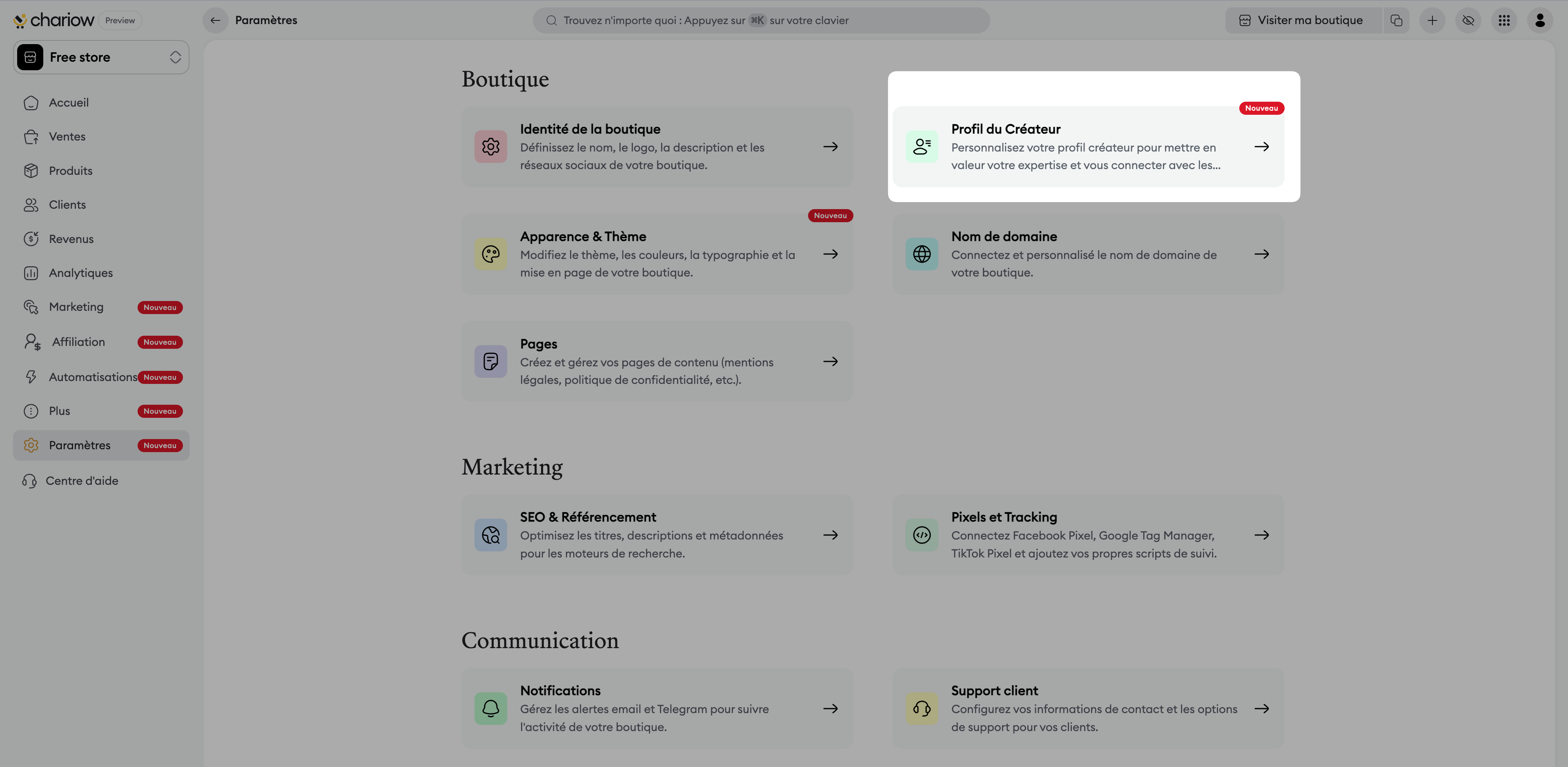 Dans la section "Boutique", cliquez sur la carte "Profil du Créateur".