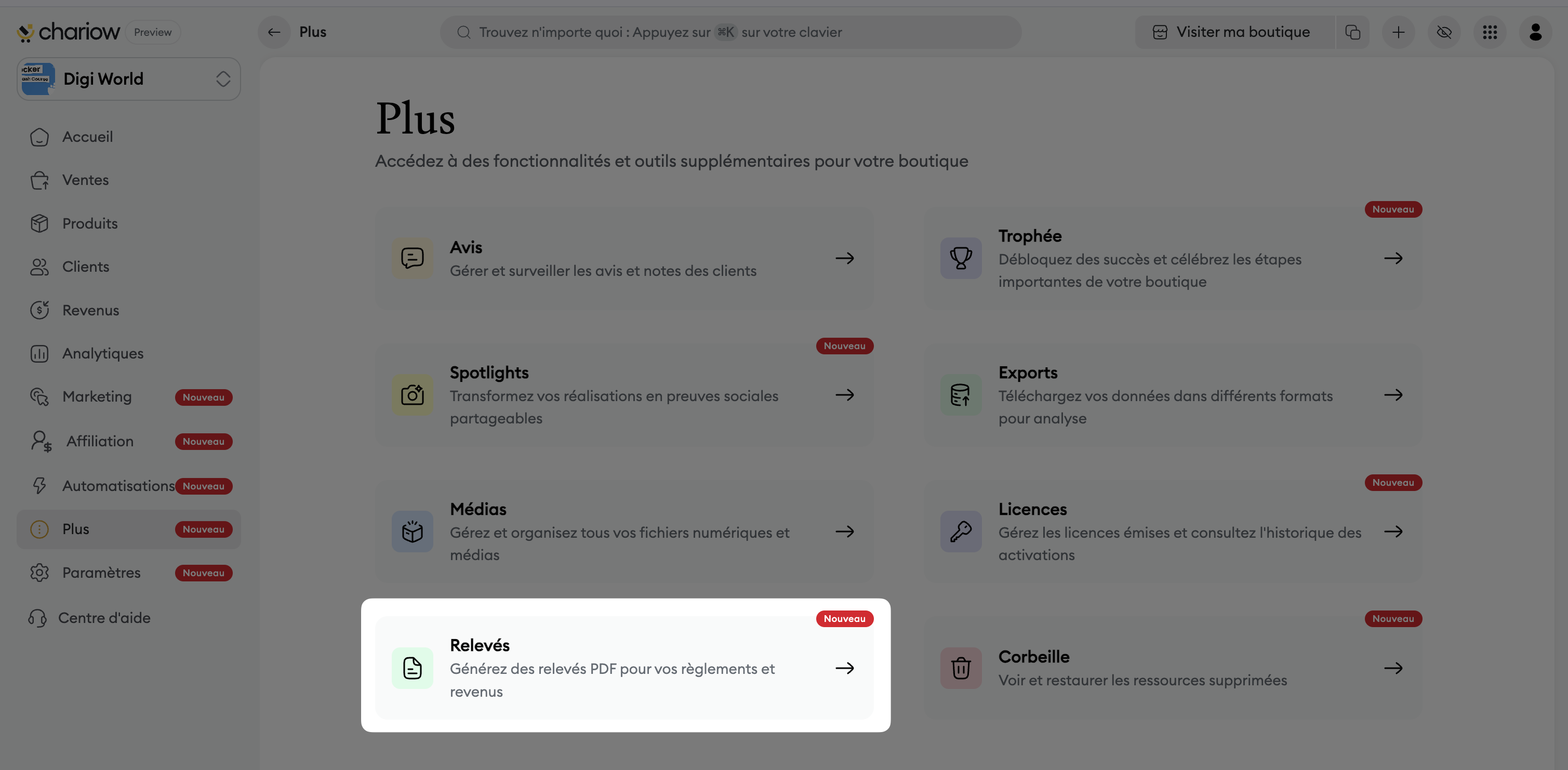 Les Relevés sont des documents PDF officiels qui récapitulent vos règlements et vos revenus. Ils sont essentiels pour votre comptabilité et le suivi de la performance financière de votre boutique. Chariow vous permet de télécharger des rapports détaillés incluant le montant total perçu et le nombre de règlements effectués, tout en suivant leur statut en temps réel.