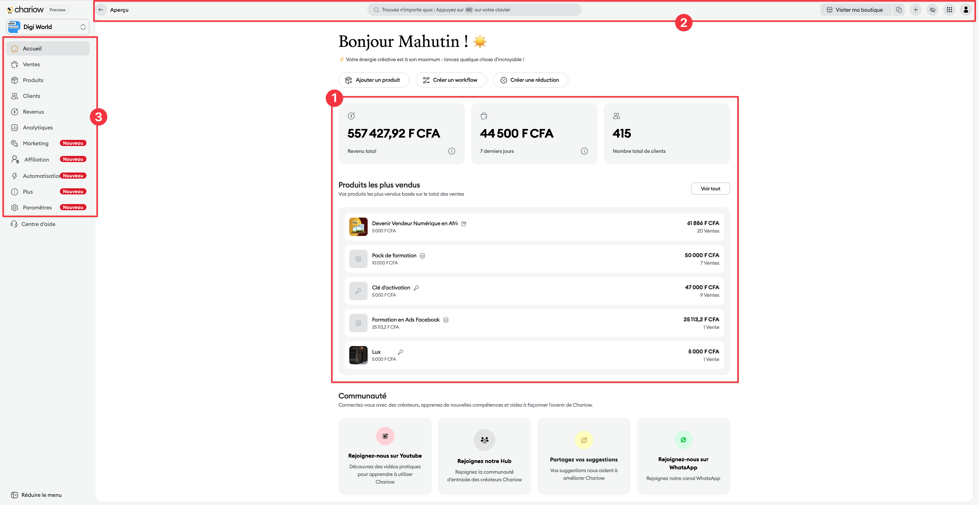 Pour maximiser votre productivité et protéger vos données, Chariow intègre des outils intelligents en haut de votre écran :