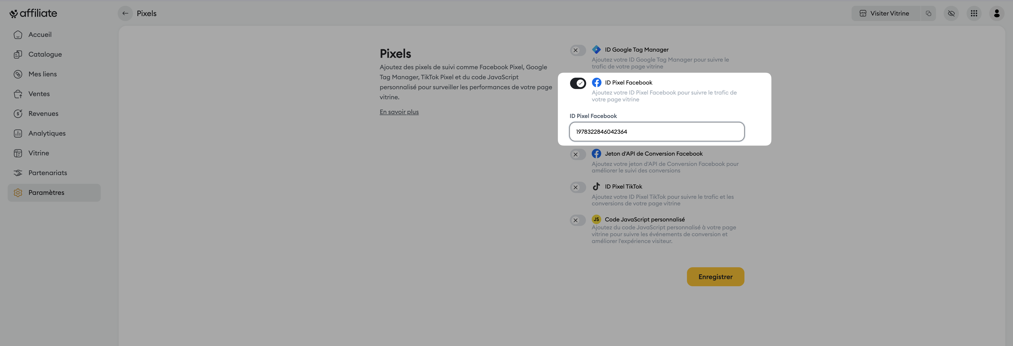 Activez l’option ID Pixel Facebook et collez l'identifiant que vous avez copié à l'étape 1.