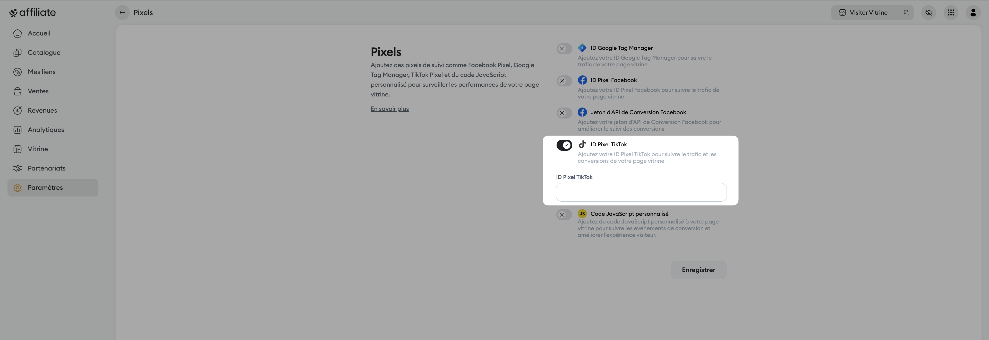 Activez l’option dédiée à TikTok, intitulée "ID Pixel TikTok".
