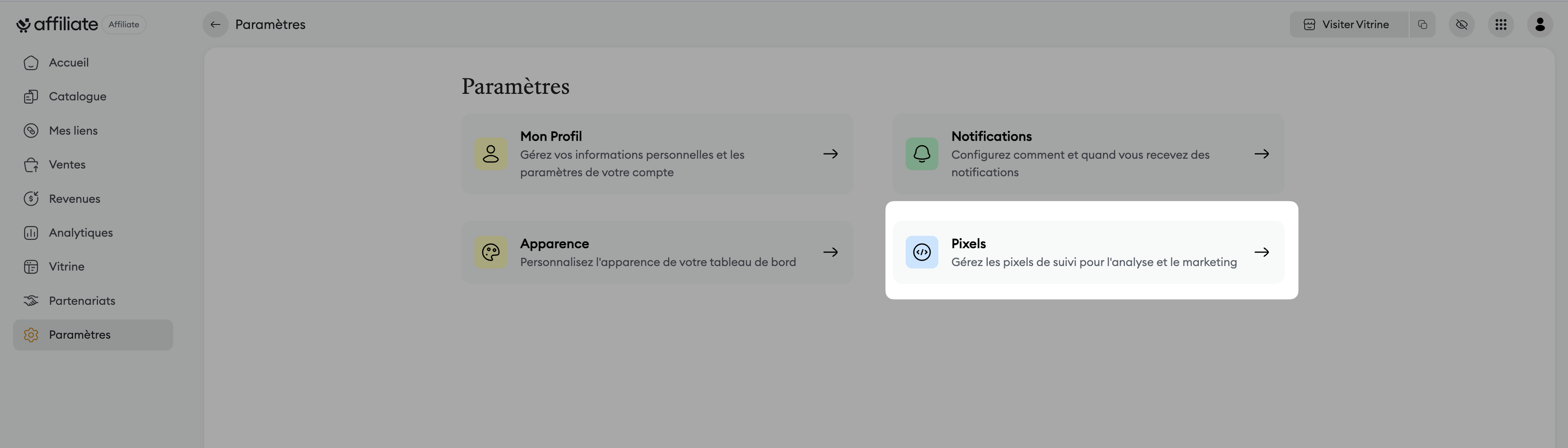 Allez dans Paramètres puis accédez à la section Pixels.