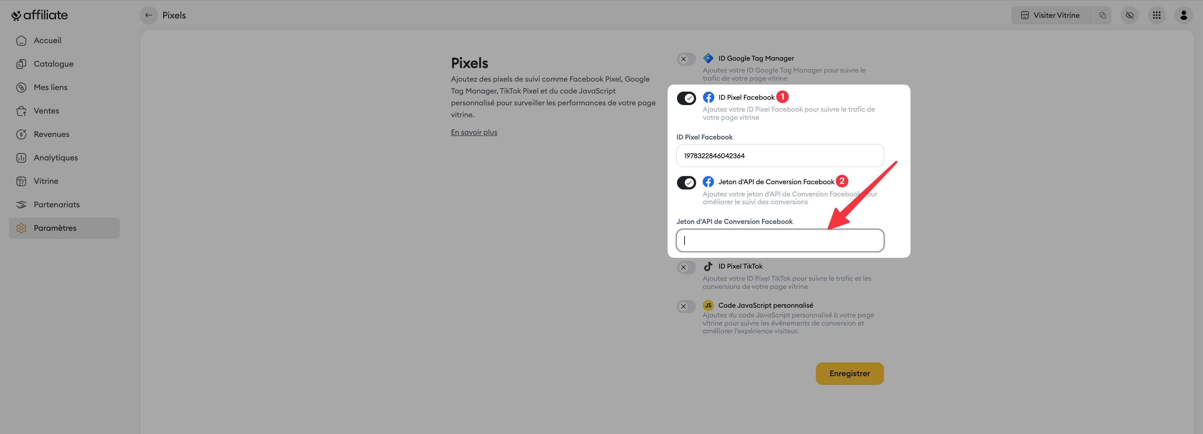 Collez votre ID de Pixel Meta (si ce n'est pas déjà fait) dans le champ approprié(1).