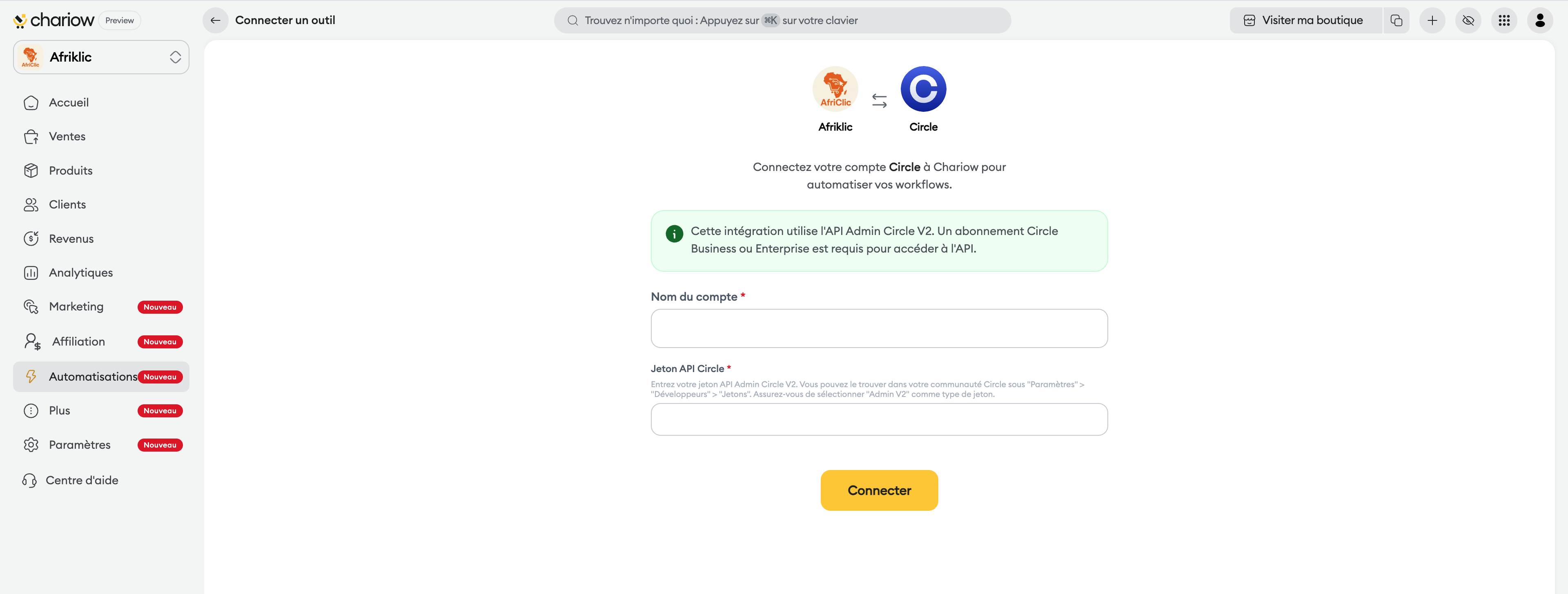 Une fois votre jeton récupéré, finalisez la connexion sur Chariow :
