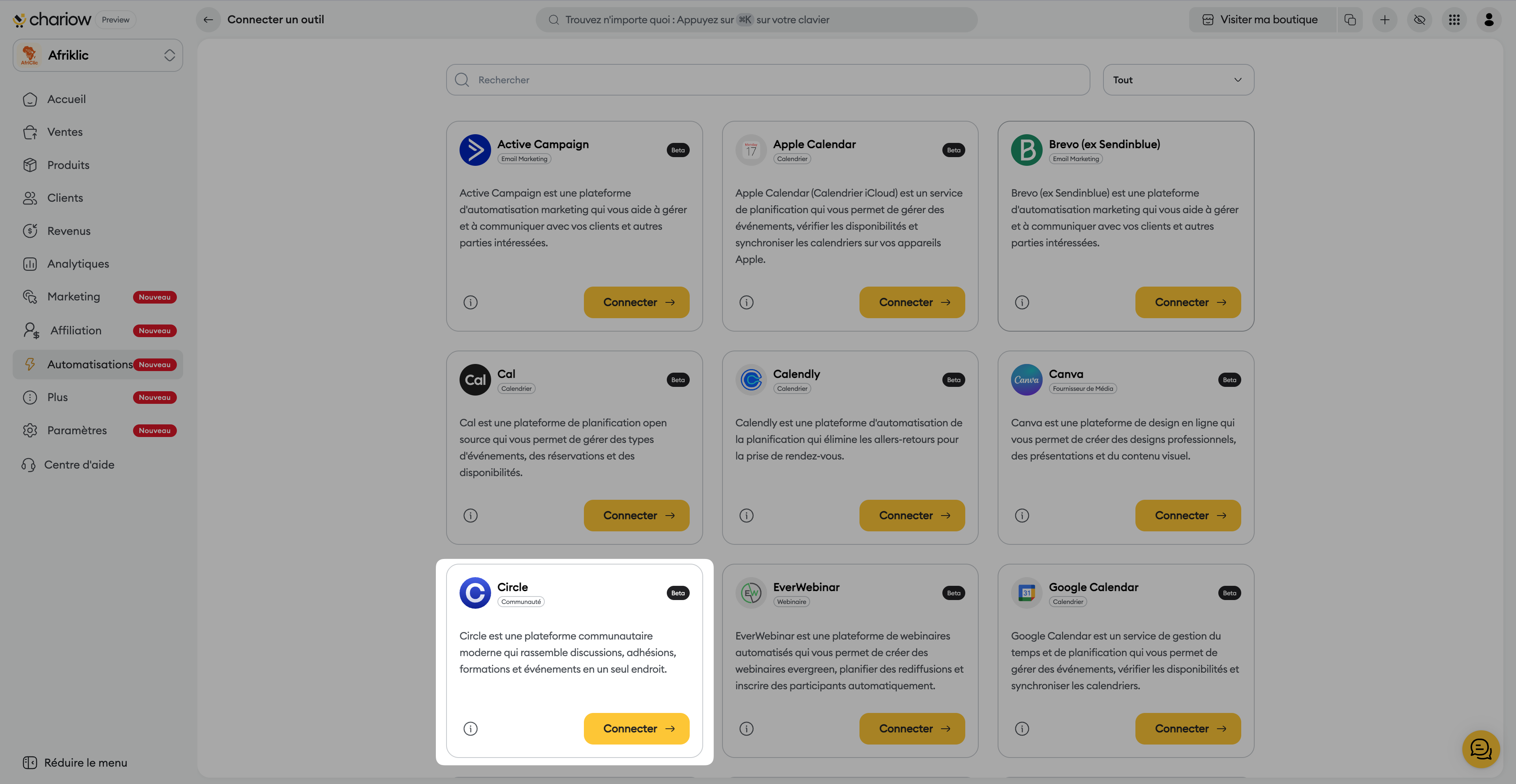 Accédez aux Automatisations : Dans le menu latéral de Chariow, cliquez sur l'onglet Automatisations.