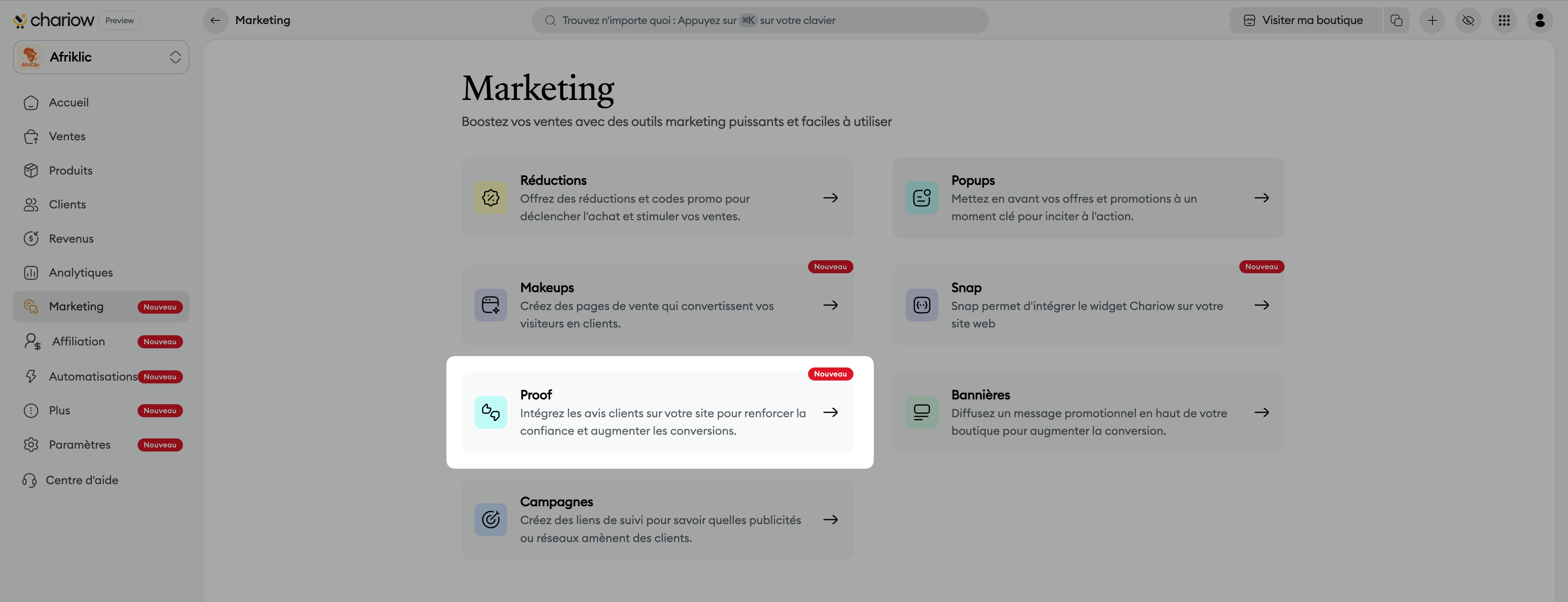 Accès au menu Marketing : Depuis votre tableau de bord, cliquez sur l'onglet Marketing dans le menu latéral.