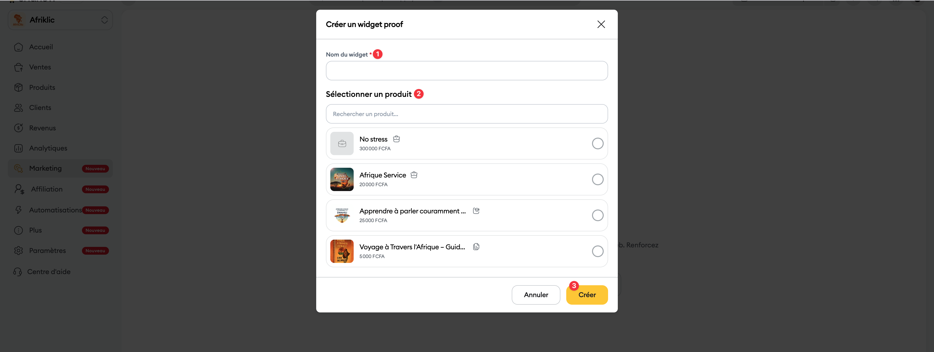 Lancement de la création : Cliquez sur le bouton Créer un widget proof.