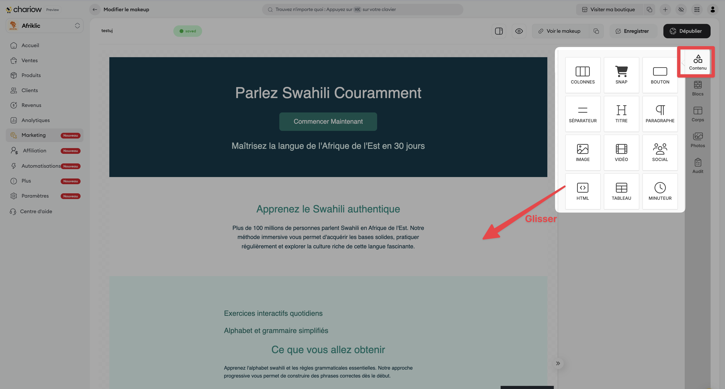 Procédure : Utilisez l'onglet Contenu pour faire glisser vos composants : Titre, Paragraphe, Bouton, Image, Vidéo, Social ou encore un Minuteur pour créer de l'urgence.