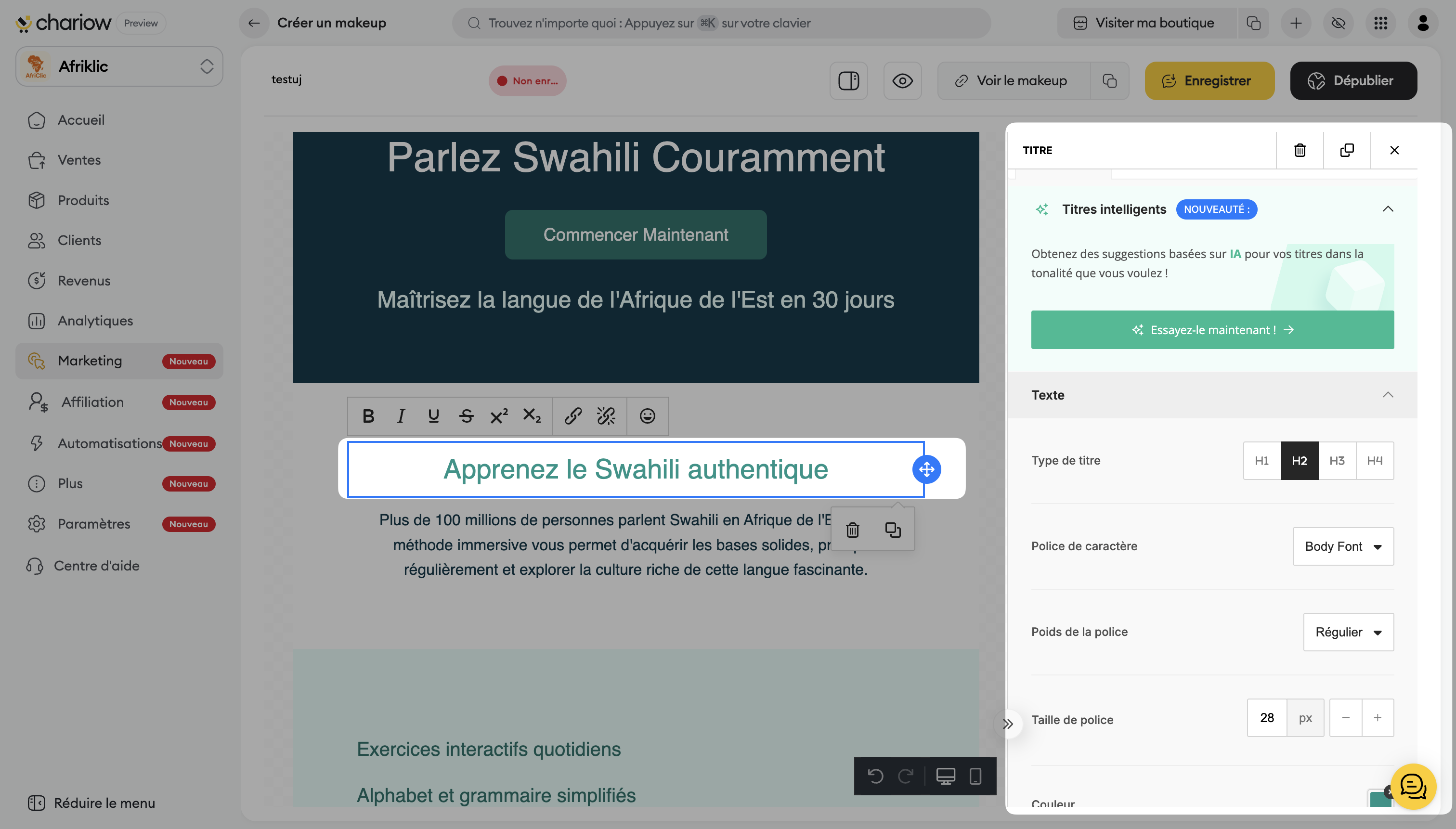 Titres intelligents (IA) : Profitez de suggestions basées sur l'intelligence artificielle pour générer des titres accrocheurs dans la tonalité que vous souhaitez.
