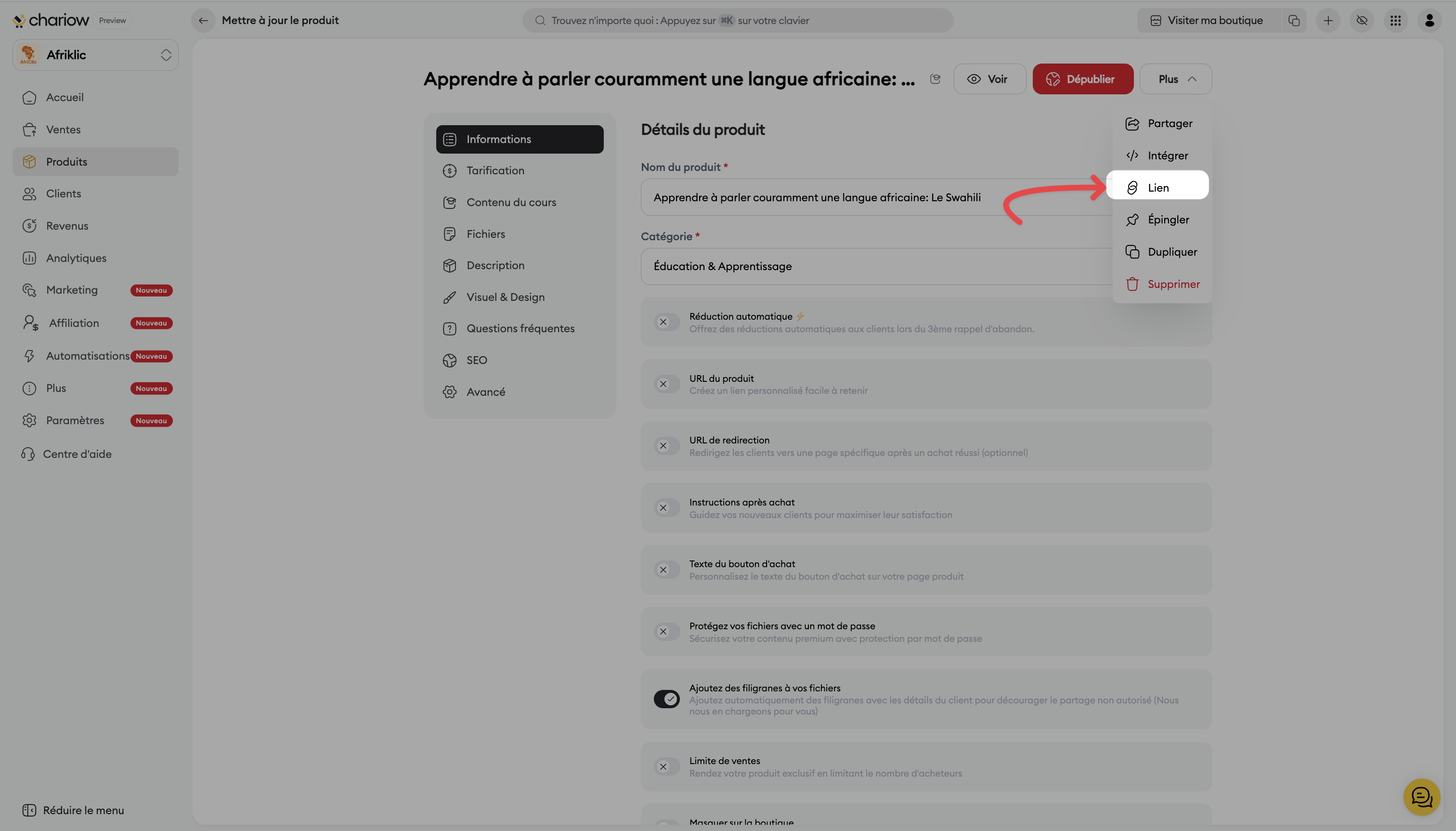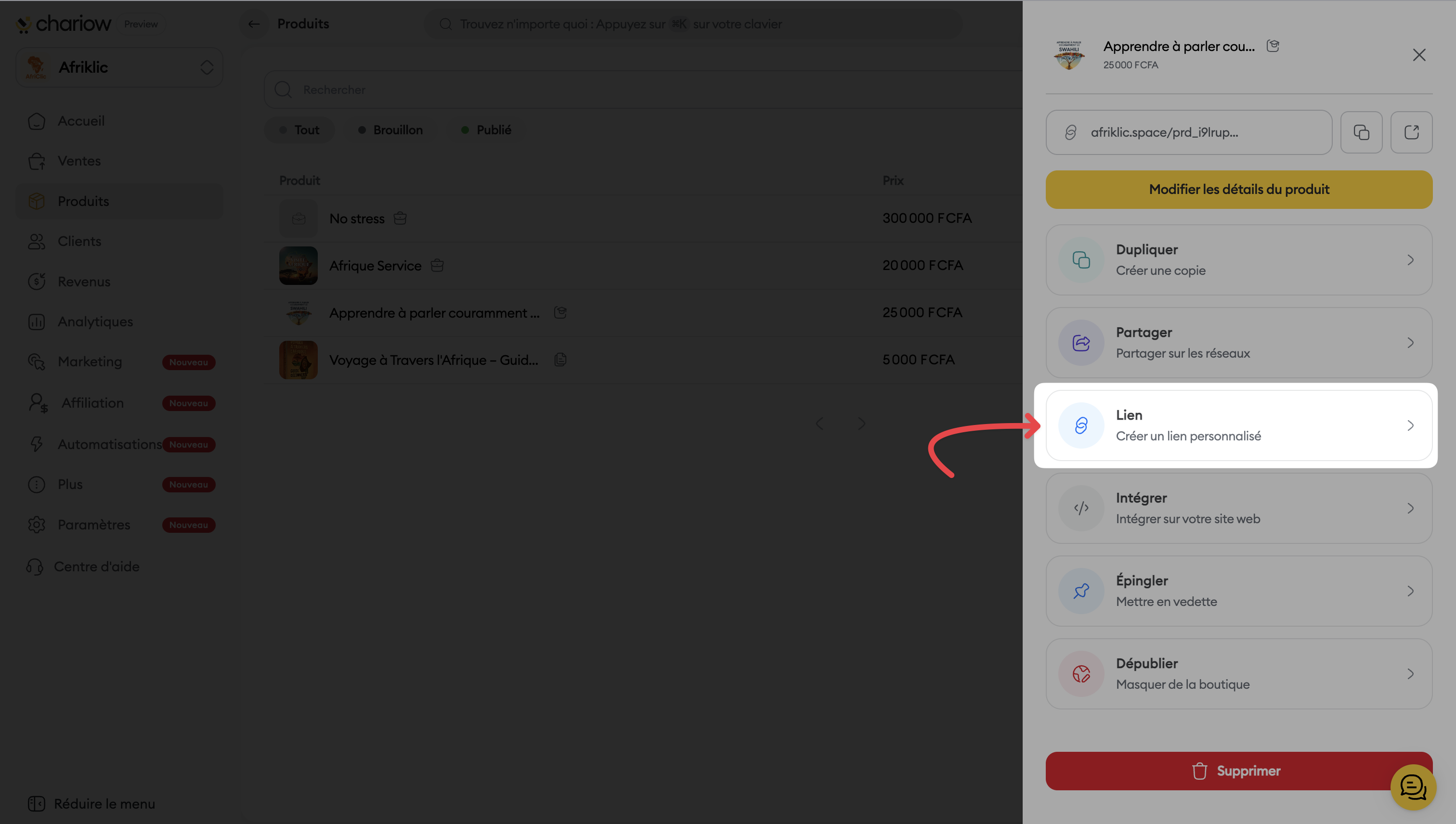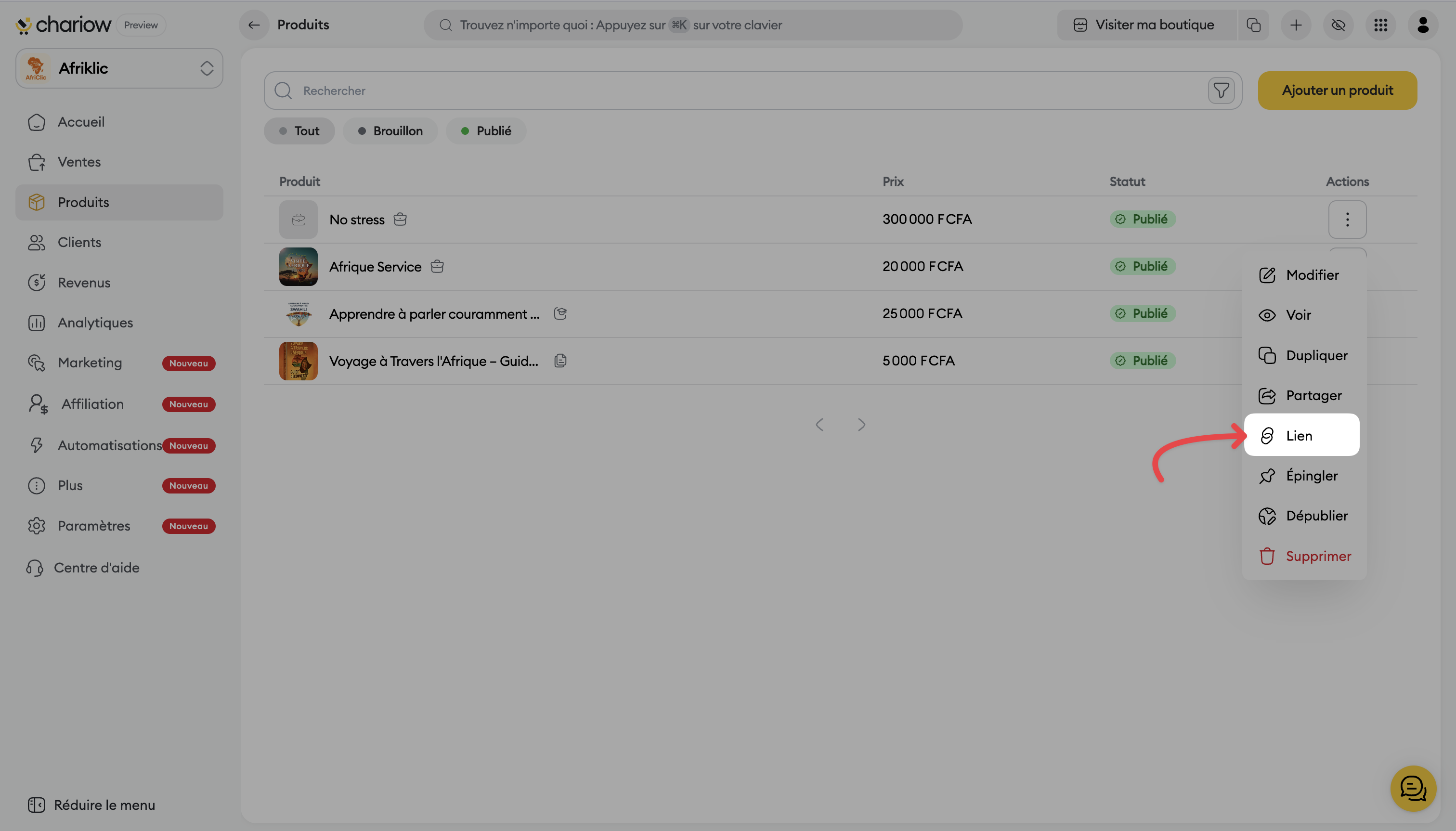 Depuis la liste des produits : Cliquez sur les trois points verticaux (⋮) à la fin de la ligne du produit et sélectionnez l'option Lien.