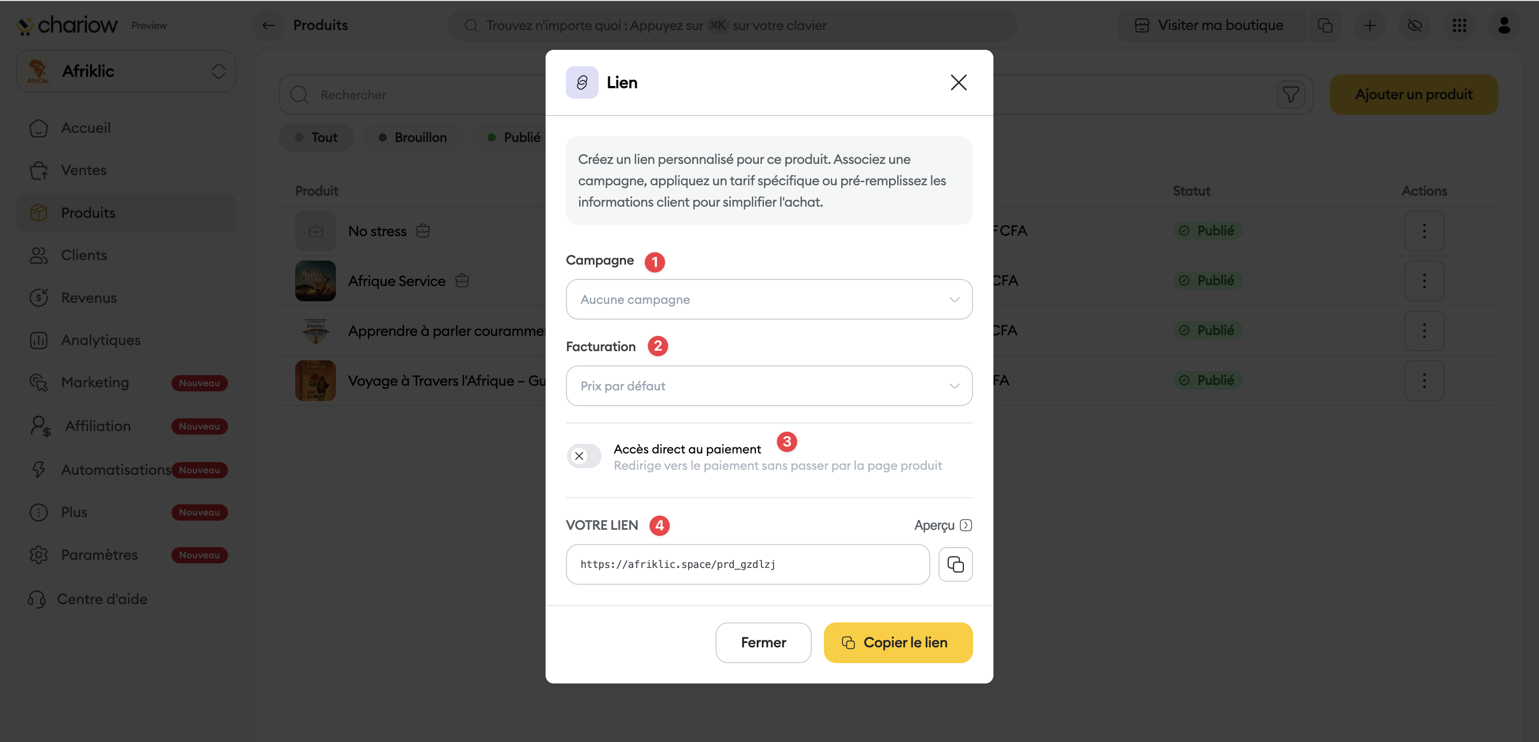 La création de liens personnalisés est une fonctionnalité avancée qui vous permet de transformer un simple lien produit en un véritable outil de suivi et d'optimisation. En associant vos liens à des paramètres précis, vous pouvez mesurer l'efficacité de vos canaux de diffusion et réduire les frictions au moment du paiement.