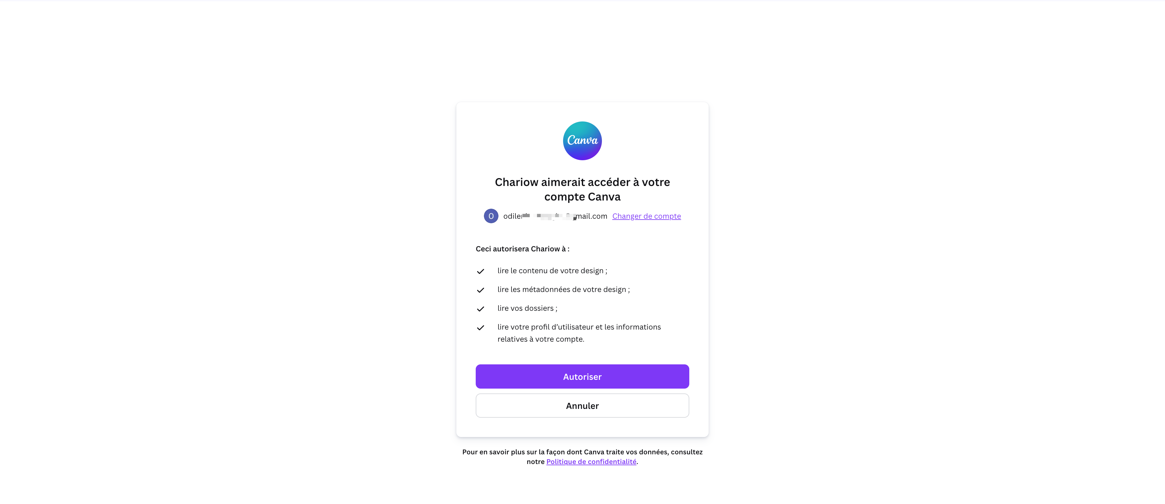 Authentification : Assurez-vous d'être bien connecté au bon compte Canva sur votre navigateur avant de cliquer sur "Autoriser" pour éviter de lier un compte personnel au lieu de votre compte professionnel.