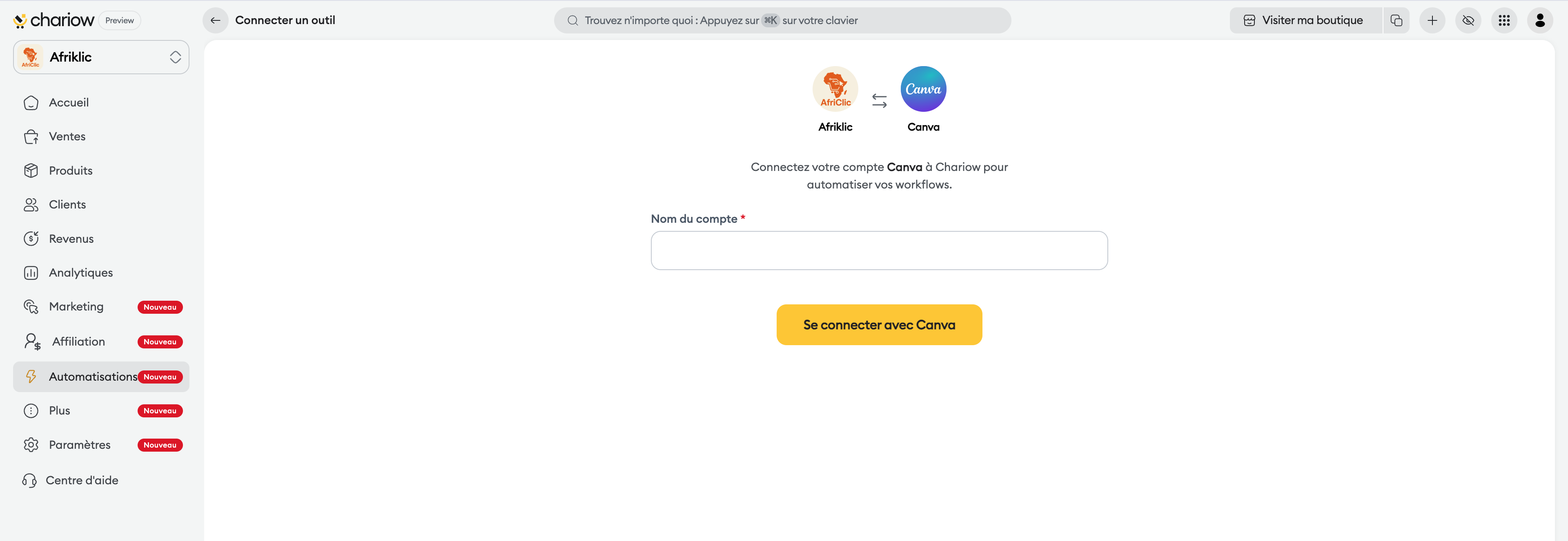 L'intégration de Canva permet à Chariow de communiquer avec votre compte de design pour automatiser certaines tâches visuelles. Que ce soit pour la gestion de vos ressources ou l'amélioration de vos processus marketing, cette connexion est un pont essentiel entre votre créativité et votre boutique.