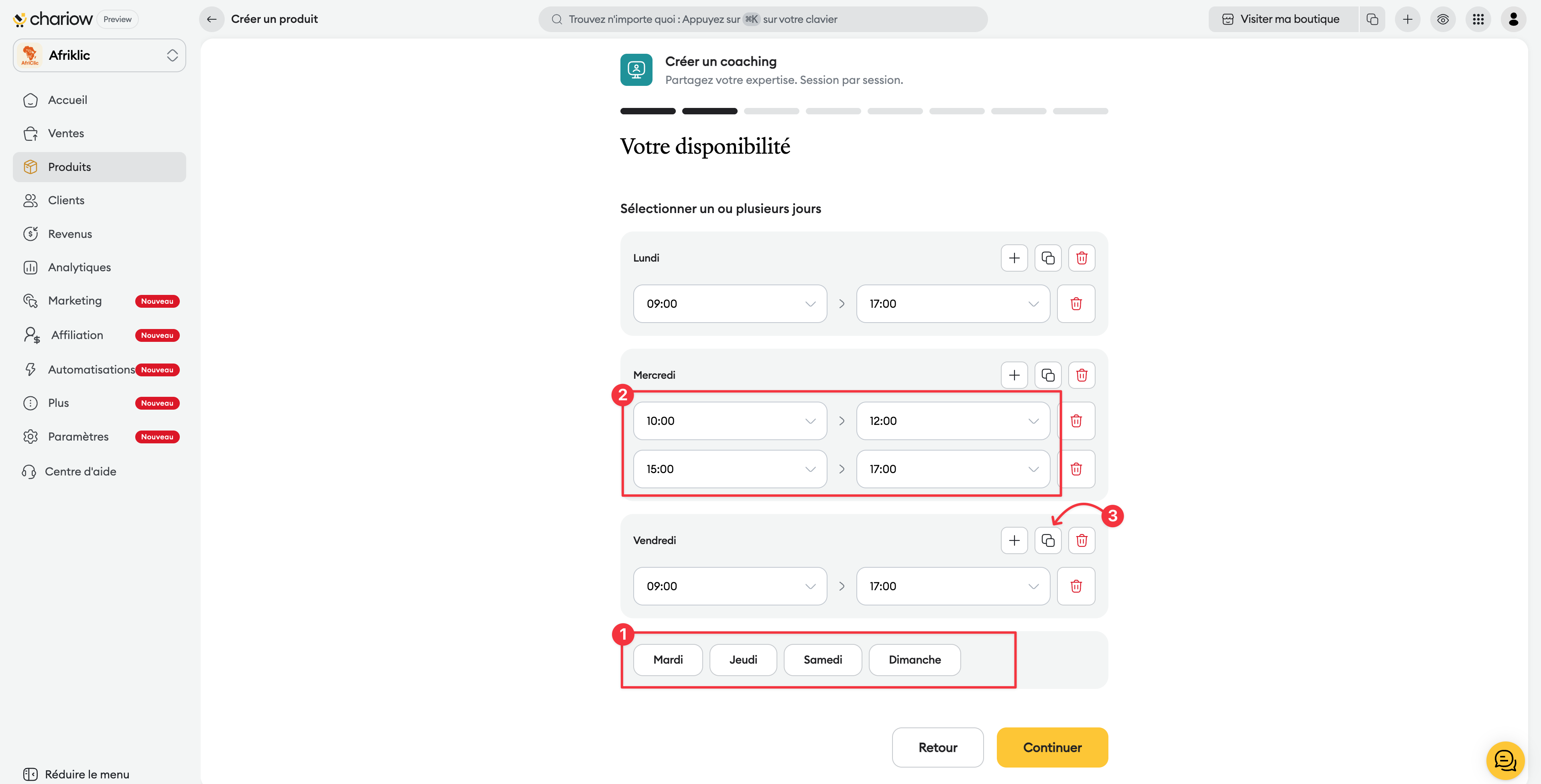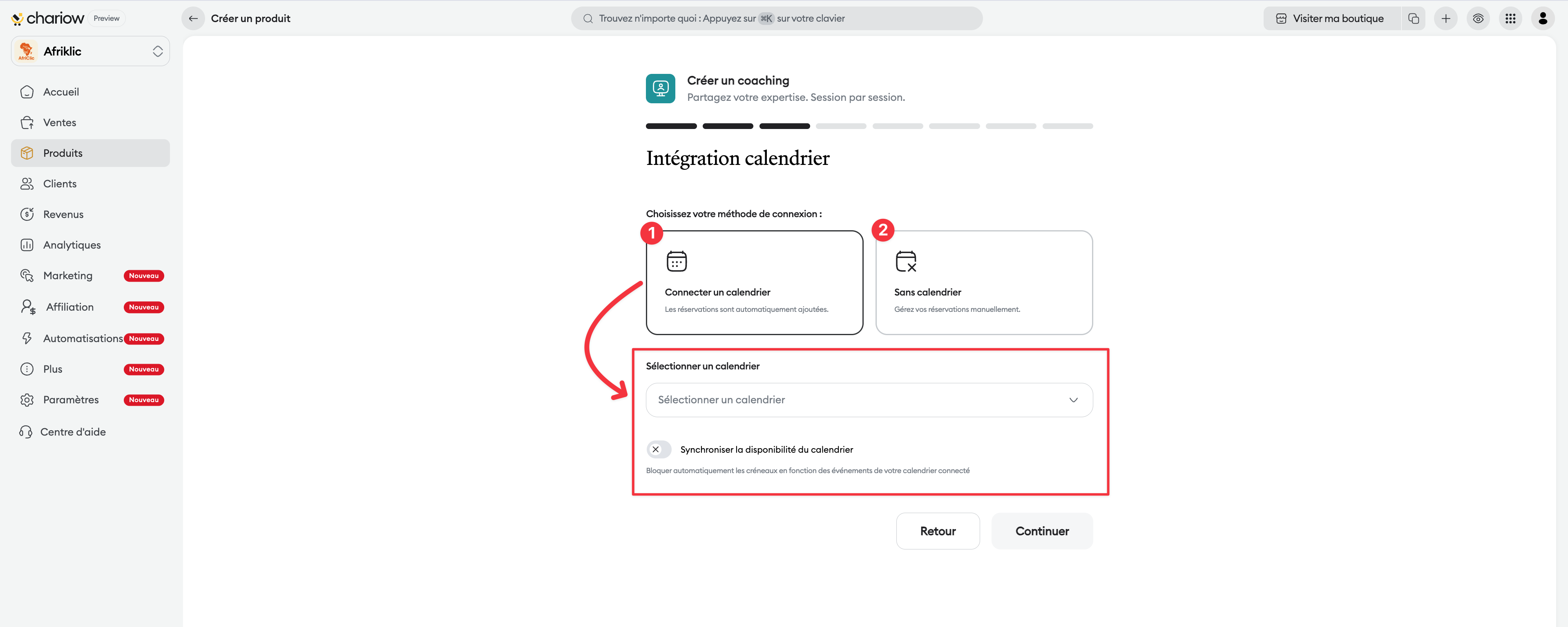 Synchronisation intelligente : Si vous connectez un calendrier, Chariow vérifiera vos indisponibilités existantes pour éviter les doubles réservations.